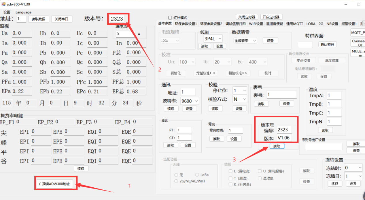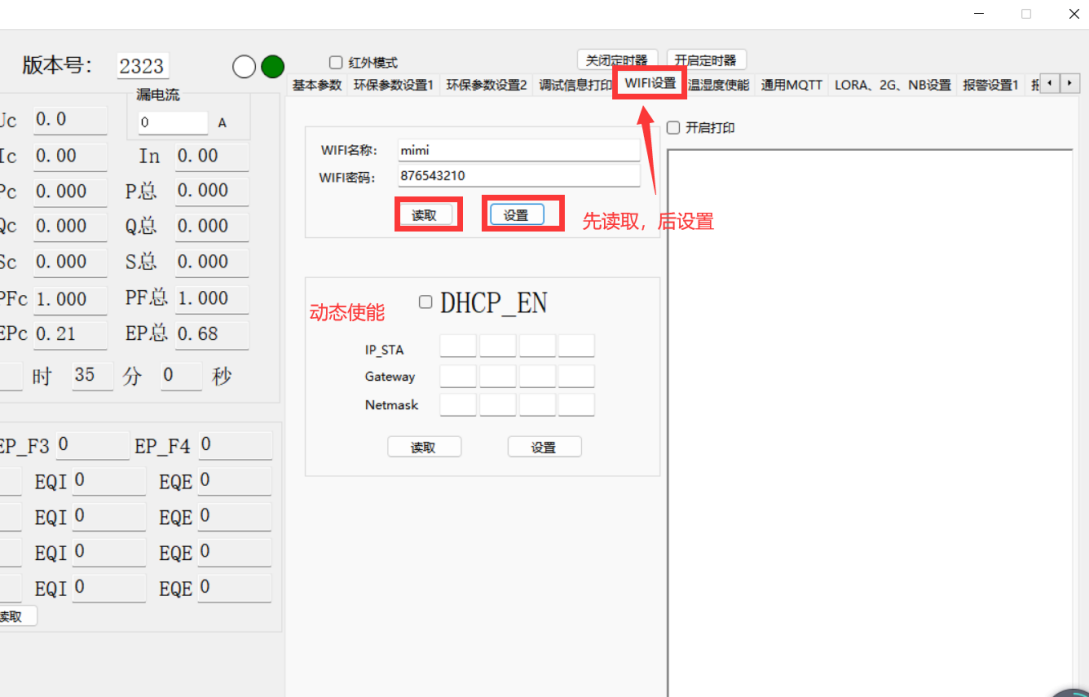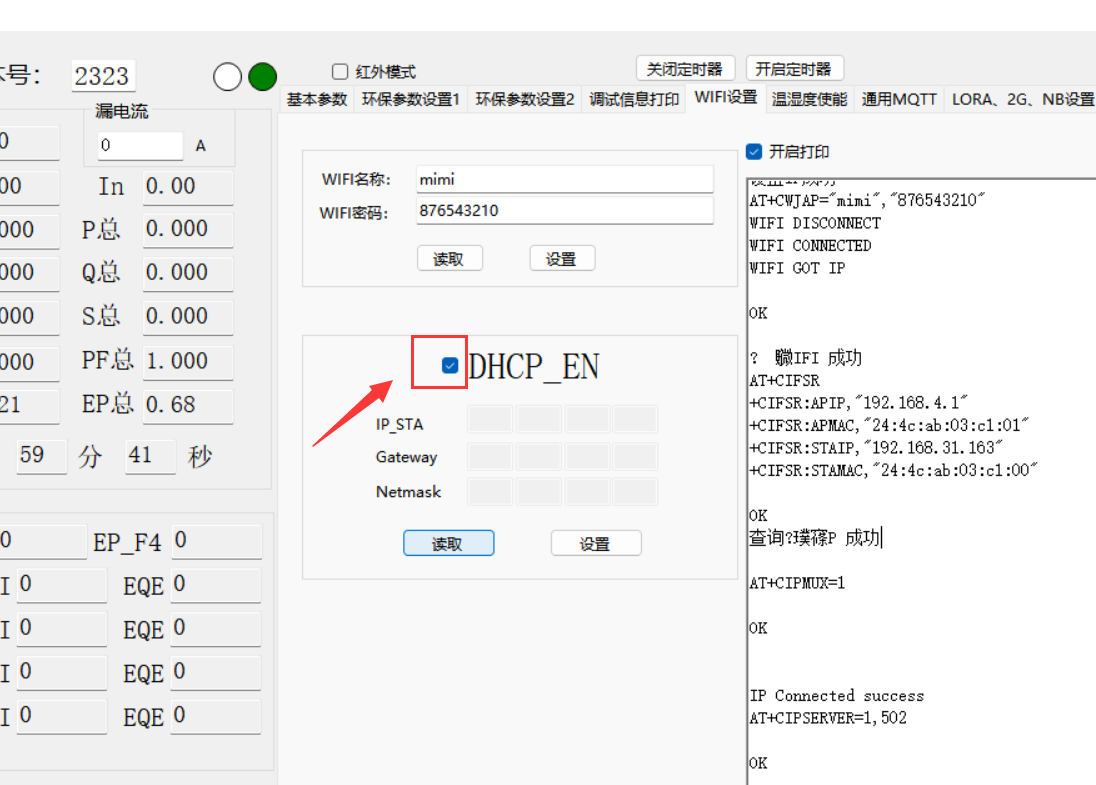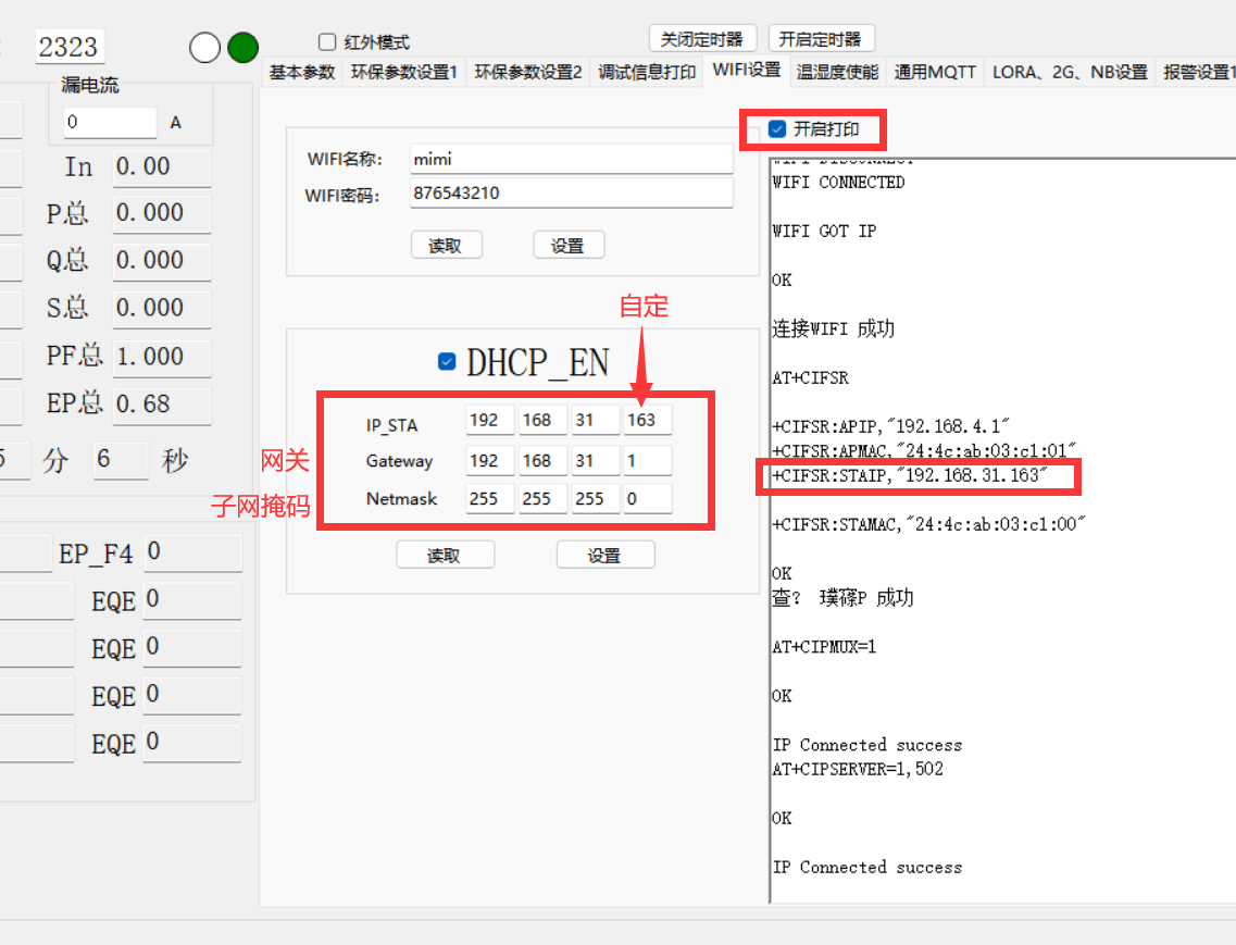 # 认识调试软件 ### 打开调试软件(准备工作) # 1.选择ADW300调试软件.exe(应用软件)   # 2.左上角点击“设置”——设置串口,波特率,停止位,校验位  # 3.点击“广播读ADW300地址”,读取到“版本号”,是“2323”就没有问题  # 在“wifi设置”,先读取,后设置 wifi名称: wifi密码:  4.1.设置DHCP\_EN(动态使能) 4.1.1自动获取IP\_STA “开启打印”,需要打开串口打印: 在“环保参数设置1”,先”读取”,然后在GPRS/NB设置打开“串口打印”。点击“设置”  再来到wifi设置——只需要勾选DHCP\_EN即可,等待自动分配的IP\_STA。 勾选“开启打印”,点击左下角,广播读adw300地址  4.1.2手动设置ip (选配IP)IP\_STA: (网关)Gateway: (子网掩码)Netmask:  选配IP:可以在连接的wifi上查找,前三位,要与wifi的ipv4地址一样,最后一位可以任意设置。比如:192.168.31.120  网关和子网掩码的内容,可以在电脑上查询到 1. 使用Windows+R键打开“运行”窗口,然后输入“cmd”进入命令提示窗口 2. 进入命令窗口之后,输入:ipconfig/all 回车即可看到整个电脑的详细的IP配置信息 3. 选择网关和子网掩码 网关:192.168.31.1 子网掩码:255.255.255.0  此时,Sever的连接已经完成,下面开始使用Modbus poll读取数据 1. **设置服务器模式和客户端模式**  **5.下面是modbus poll来测试tcp/ip连接状况,详细的连接设置如下:**  注意,设置“读/写定义”时,从站:电表通讯地址