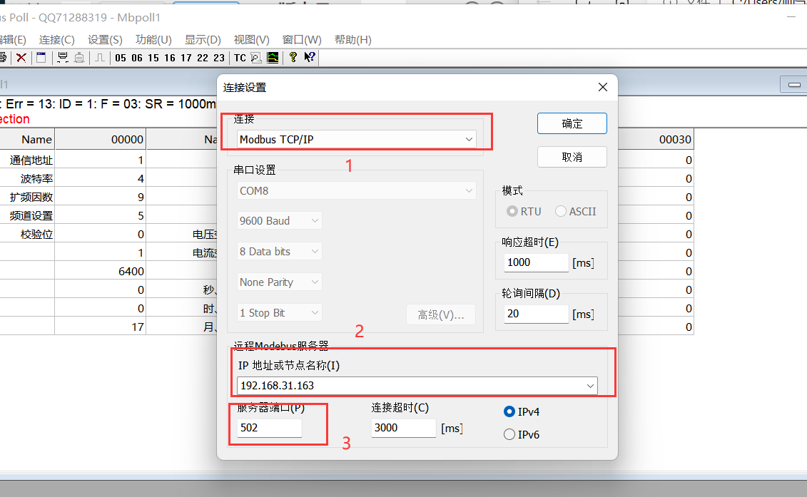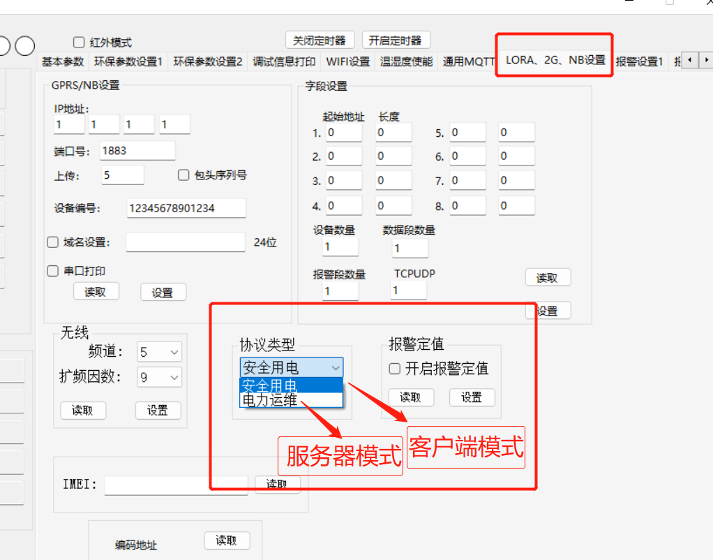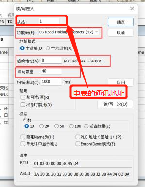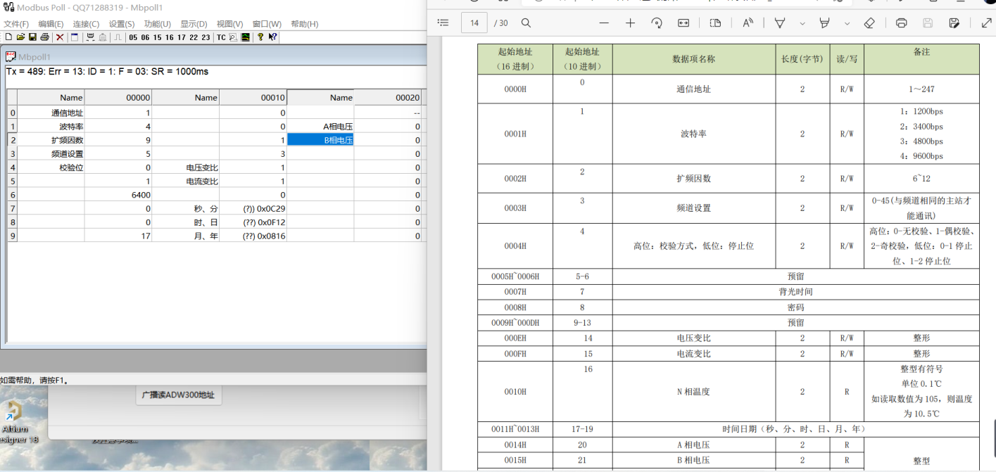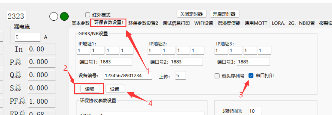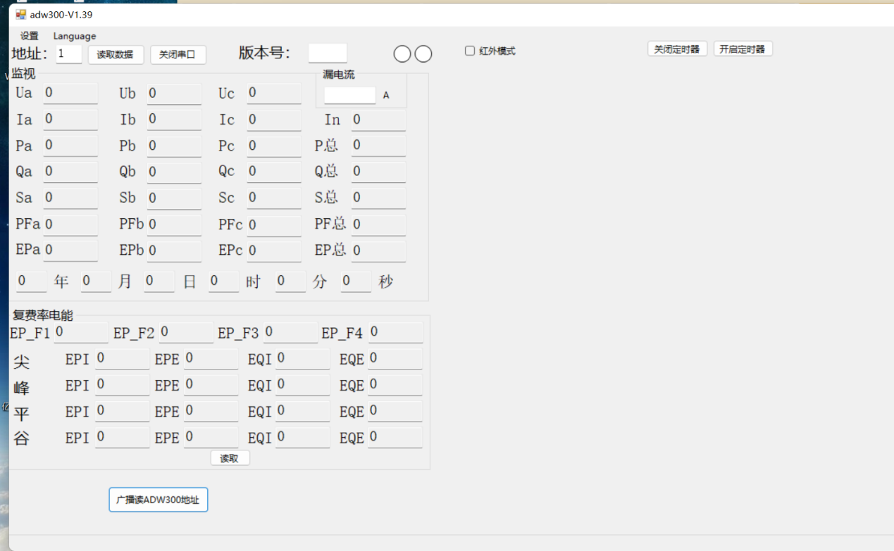 # 认识调试软件 ### 打开调试软件(准备工作) # 1.选择ADW300调试软件.exe(应用软件)   # 2.左上角点击“设置”——设置串口,波特率,停止位,校验位  # 3.点击“广播读ADW300地址”,读取到“版本号”,是“2323”就没有问题  # 在“wifi设置”,先读取,后设置 wifi名称: wifi密码:  4.1.设置DHCP\_EN(动态使能) 4.1.1自动获取IP\_STA “开启打印”,需要打开串口打印: 在“环保参数设置1”,先”读取”,然后在GPRS/NB设置打开“串口打印”。点击“设置”  再来到wifi设置——只需要勾选DHCP\_EN即可,等待自动分配的IP\_STA。 勾选“开启打印”,点击左下角,广播读adw300地址  4.1.2手动设置ip (选配IP)IP\_STA: (网关)Gateway: (子网掩码)Netmask:  选配IP:可以在连接的wifi上查找,前三位,要与wifi的ipv4地址一样,最后一位可以任意设置。比如:192.168.31.120  网关和子网掩码的内容,可以在电脑上查询到 1. 使用Windows+R键打开“运行”窗口,然后输入“cmd”进入命令提示窗口 2. 进入命令窗口之后,输入:ipconfig/all 回车即可看到整个电脑的详细的IP配置信息 3. 选择网关和子网掩码 网关:192.168.31.1 子网掩码:255.255.255.0  此时,Sever的连接已经完成,下面开始使用Modbus poll读取数据 1. **设置服务器模式和客户端模式**  **5.下面是modbus poll来测试tcp/ip连接状况,详细的连接设置如下:**  注意,设置“读/写定义”时,从站:电表通讯地址