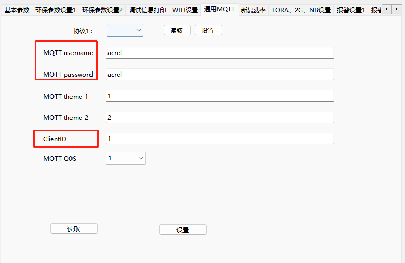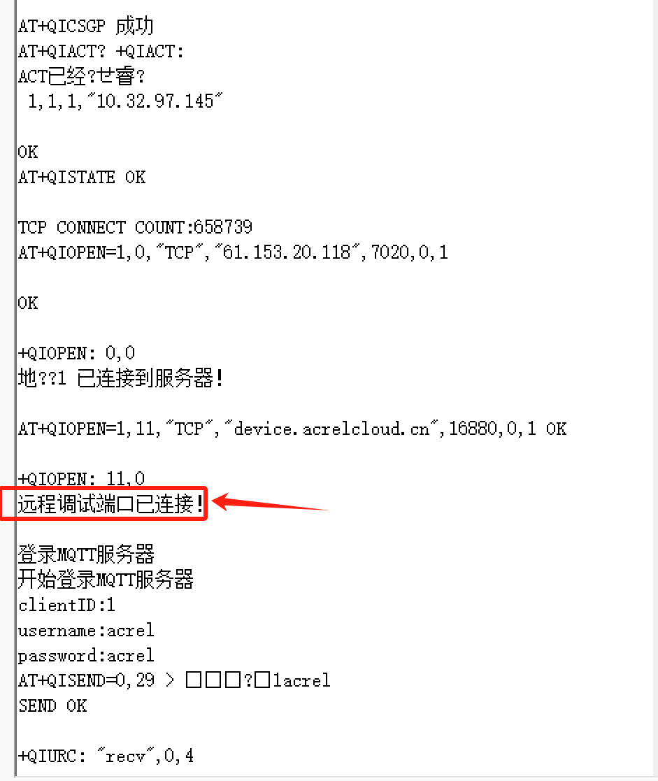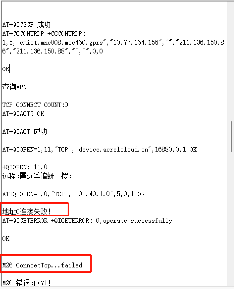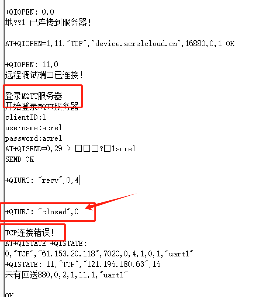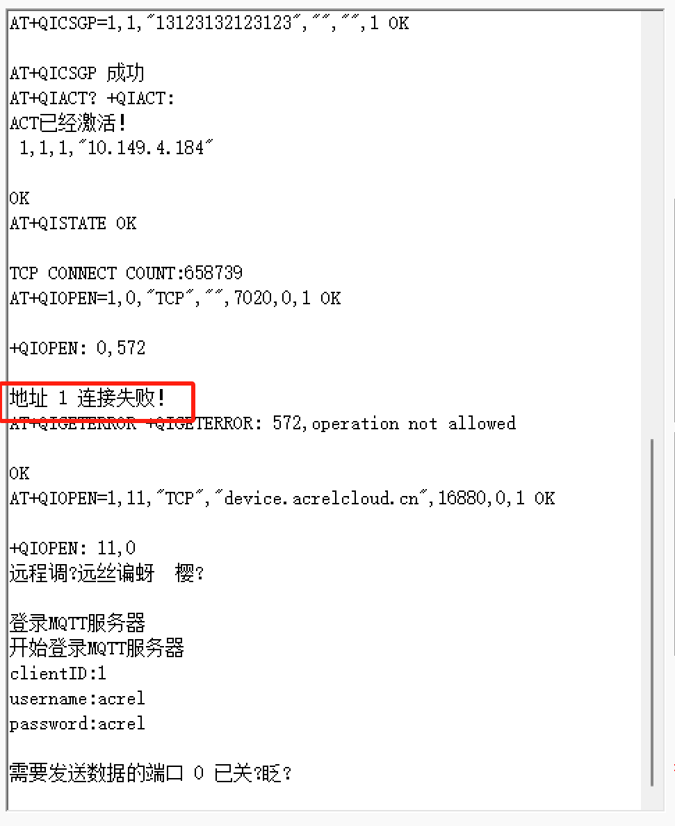 无线仪表不在线问题排查 目录 一、如何查看调试打印信息 1 二、无线仪表调试问题排查 2 1. 安全用电 2 3. MQTT 5 (1) 4G-MQTT 5 (2) WIFI-MQTT 13 # 一 如何查看调试打印信息 打开ADW300调试软件,如图一所示,先点击下方的广播读通讯地址,确认上方的版本号;2228对应4G-安全用电协议,2294对应4G-MQTT协议,2323对应WiFi-modbustcp协议,2457对应WiFi-MQTT协议;其他版本若不知道是什么协议,联系工程师确认。  图一 2228版本按照图三先读取,再勾选串口打印,最后点击设置,提示设置成功即可; 其余版本按照图二先读取,再勾选串口打印,最后点击设置,提示设置成功即可。  图二  图三 # 二 无线仪表调试问题排查 ## 1 安全用电 (1)如果打印信息出现图四所示的内容:“M26 SIM Card ...NOT READY”表示仪表未检测到物联网卡。请检查是否插入物联网卡,或者物联网卡是否激活。  图四 1. 如图五所示,提示“M26 SIM Card ...READY!”表示检测到卡,如果提示“GPRS附着失败”,可能是卡没流量了或者物联网卡被锁定了,也有可能是使用的物联网卡需要设置APN。  图五 1. 如图六所示,提示“M26 ConncetTcp...failed!”,表示服务器IP端口连接失败,请检查配置的IP端口是否正确,如配置无误再检查连接的服务器状态是否正常。  图六 1. 连接服务器成功之后,如图七所示,仪表会进行注册,对时,数据上报的操作,针对每一个步骤,服务器端都要一一进行回复,如果不回复,仪表会断开连接并重连,如果出现反复重连的现象请检查回复机制是否遗漏。  图七 ## 2 MQTT ### 2.1 4G-MQTT * + - 1. 如果打印信息出现图八所示的内容:“M26 SIM Card ...NOT READY”表示仪表未检测到物联网卡。请检查是否插入物联网卡,或者物联网卡是否激活。  图八 * + - 1. 如图九所示,提示“M26 SIM Card ...READY!”表示检测到卡,如果提示“GPRS附着失败”可能是卡没流量了或者物联网卡被锁定了,也有可能是使用的物联网卡需要设置APN  图九 * + - 1. 如图十所示,如果出现“地址1连接失败”,请检查图十一的IP端口等配置;配置无误仍连接失败,请检查是否需要使用转网卡或定向卡。  图十  图十一 * + - 1. 如图十二所示,如果提示地址1已连接到服务器,地址2连接失败,请检查图十三处的端口连接数是否为1,不为1请修改成1  图十二  图十三 * + - 1. 如图十四所示,如果出现“远程调试端口连接失败”,请确认是否使用专网卡或定向卡,如使用则需要将我司远程服务端口加入白名单: http : safe.acrelcloud.cn TCP: device.acrelcloud.cn  图十四 * + - 1. 如图十五所示,如果在登录MQTT服务器过程中,出现“closed”,请检查图十六处的MQTT相关参数是否设置正确。  图十五  图十六 * + - 1. 如图十七所示,连接成功之后,只能收到ID:0-35项数据,收不到ID:36-72项数据,请检查图十八处的MQTT参数设置中的QOS是否正确设置成1,如果不是1请修改。  图十七  图十八 ### 2.2 WIFI-MQTT * + - 1. 如图十九所示,如果出现“连接WIFI 失败”,“WIFI set...failed”等字样,表示WIFI连接失败, AT+CWJAP="mimi1","876543210" (此处为WIFI的账号密码),连接失败请检查此处是否正确 +CWJAP:3(此处的数字表示错误原因) 1:连接超时 2:密码错误 3:无法找到目标 AP 4:连接失败 ,如果检查账号密码没问题,请检查WIFI是不是2.4GHZ的,WiFi仪表目前只支持2.4ghz。  图十九 * + - 1. 如图二十所示,WIFI连接成功后,出现“WIFI ConncetTcp...failed”,请检查IP端口等配置;配置无误仍连不上,检查是否有防火墙。  图二十