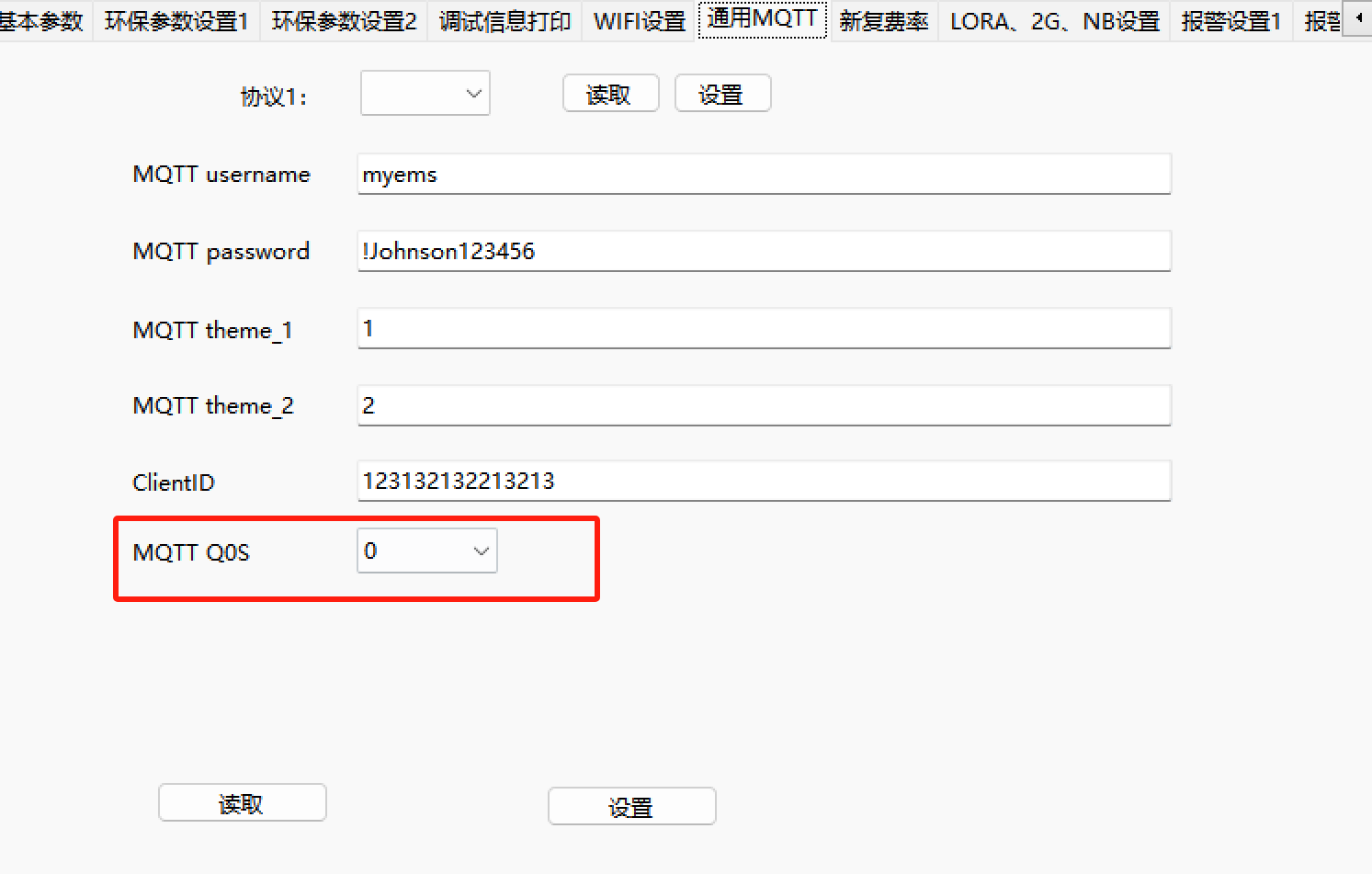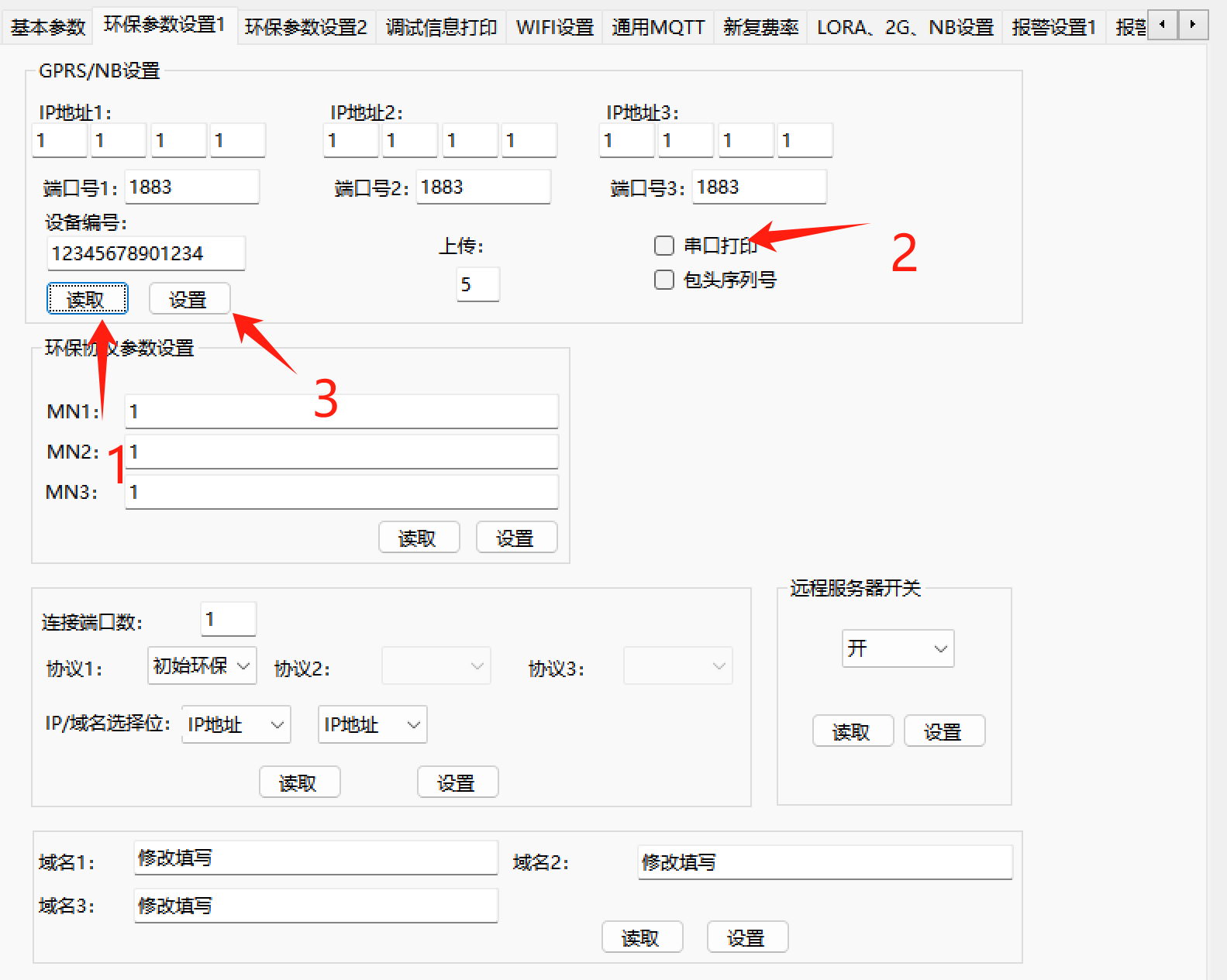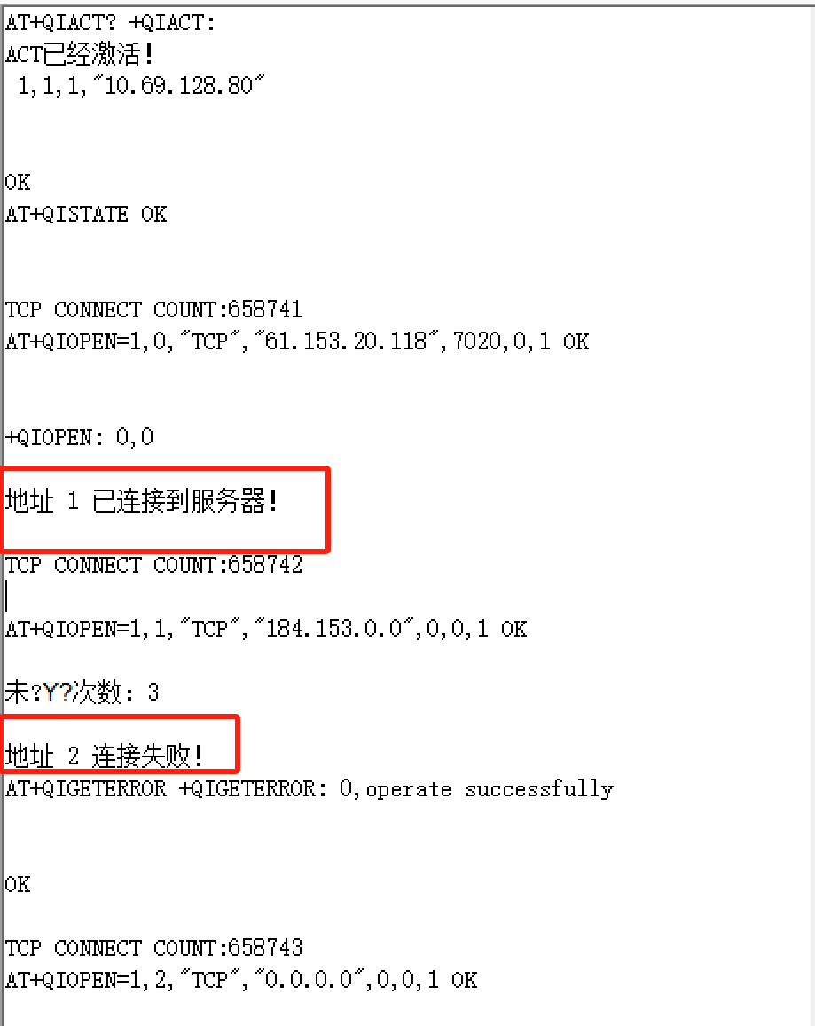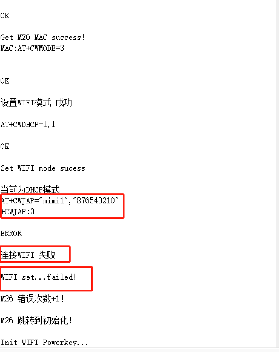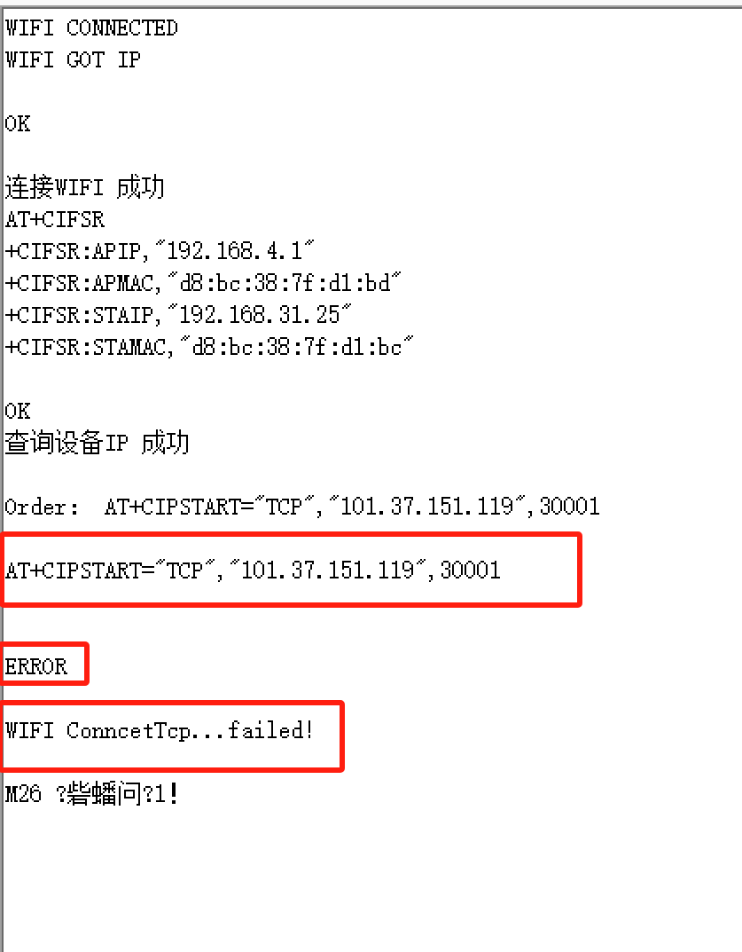 无线仪表不在线问题排查 目录 一、如何查看调试打印信息 1 二、无线仪表调试问题排查 2 1. 安全用电 2 3. MQTT 5 (1) 4G-MQTT 5 (2) WIFI-MQTT 13 # 一 如何查看调试打印信息 打开ADW300调试软件,如图一所示,先点击下方的广播读通讯地址,确认上方的版本号;2228对应4G-安全用电协议,2294对应4G-MQTT协议,2323对应WiFi-modbustcp协议,2457对应WiFi-MQTT协议;其他版本若不知道是什么协议,联系工程师确认。  图一 2228版本按照图三先读取,再勾选串口打印,最后点击设置,提示设置成功即可; 其余版本按照图二先读取,再勾选串口打印,最后点击设置,提示设置成功即可。  图二  图三 # 二 无线仪表调试问题排查 ## 1 安全用电 (1)如果打印信息出现图四所示的内容:“M26 SIM Card ...NOT READY”表示仪表未检测到物联网卡。请检查是否插入物联网卡,或者物联网卡是否激活。  图四 1. 如图五所示,提示“M26 SIM Card ...READY!”表示检测到卡,如果提示“GPRS附着失败”,可能是卡没流量了或者物联网卡被锁定了,也有可能是使用的物联网卡需要设置APN。  图五 1. 如图六所示,提示“M26 ConncetTcp...failed!”,表示服务器IP端口连接失败,请检查配置的IP端口是否正确,如配置无误再检查连接的服务器状态是否正常。  图六 1. 连接服务器成功之后,如图七所示,仪表会进行注册,对时,数据上报的操作,针对每一个步骤,服务器端都要一一进行回复,如果不回复,仪表会断开连接并重连,如果出现反复重连的现象请检查回复机制是否遗漏。  图七 ## 2 MQTT ### 2.1 4G-MQTT * + - 1. 如果打印信息出现图八所示的内容:“M26 SIM Card ...NOT READY”表示仪表未检测到物联网卡。请检查是否插入物联网卡,或者物联网卡是否激活。  图八 * + - 1. 如图九所示,提示“M26 SIM Card ...READY!”表示检测到卡,如果提示“GPRS附着失败”可能是卡没流量了或者物联网卡被锁定了,也有可能是使用的物联网卡需要设置APN  图九 * + - 1. 如图十所示,如果出现“地址1连接失败”,请检查图十一的IP端口等配置;配置无误仍连接失败,请检查是否需要使用转网卡或定向卡。  图十  图十一 * + - 1. 如图十二所示,如果提示地址1已连接到服务器,地址2连接失败,请检查图十三处的端口连接数是否为1,不为1请修改成1  图十二  图十三 * + - 1. 如图十四所示,如果出现“远程调试端口连接失败”,请确认是否使用专网卡或定向卡,如使用则需要将我司远程服务端口加入白名单: http : safe.acrelcloud.cn TCP: device.acrelcloud.cn  图十四 * + - 1. 如图十五所示,如果在登录MQTT服务器过程中,出现“closed”,请检查图十六处的MQTT相关参数是否设置正确。  图十五  图十六 * + - 1. 如图十七所示,连接成功之后,只能收到ID:0-35项数据,收不到ID:36-72项数据,请检查图十八处的MQTT参数设置中的QOS是否正确设置成1,如果不是1请修改。  图十七  图十八 ### 2.2 WIFI-MQTT * + - 1. 如图十九所示,如果出现“连接WIFI 失败”,“WIFI set...failed”等字样,表示WIFI连接失败, AT+CWJAP="mimi1","876543210" (此处为WIFI的账号密码),连接失败请检查此处是否正确 +CWJAP:3(此处的数字表示错误原因) 1:连接超时 2:密码错误 3:无法找到目标 AP 4:连接失败 ,如果检查账号密码没问题,请检查WIFI是不是2.4GHZ的,WiFi仪表目前只支持2.4ghz。  图十九 * + - 1. 如图二十所示,WIFI连接成功后,出现“WIFI ConncetTcp...failed”,请检查IP端口等配置;配置无误仍连不上,检查是否有防火墙。  图二十