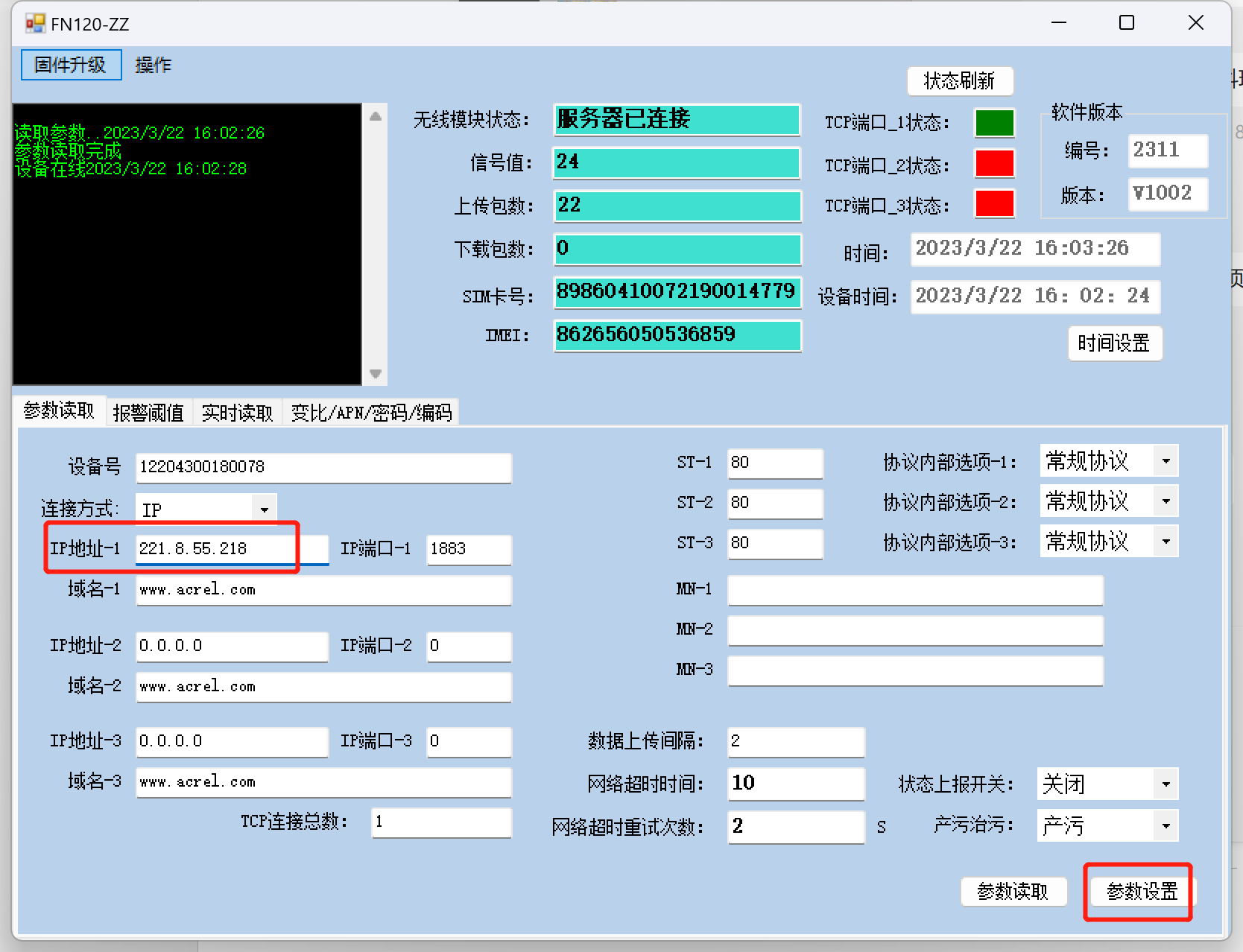 1. 打开远程调试软件,按下图进行选择后点击远程调试  1. 输入设备编码和密码,密码为0000  1. 读取参数 先点击参数读取,提示读取成功后再进行设置  1. 参数设置 将要修改的IP填到对应位置点击设置,左上角提示设置成功即可