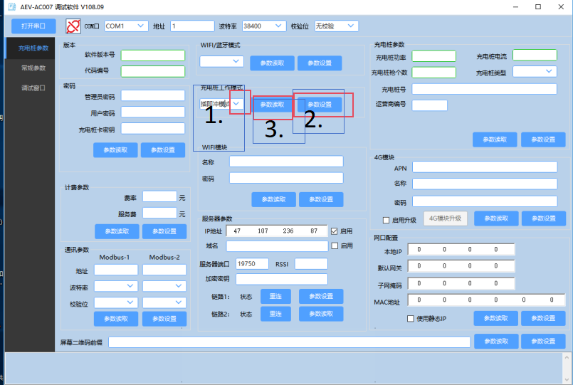 7kw交流充电桩正常模式改即插即用操作说明 1. 用通讯线连接电脑和 AEV-AC007D系列用USB转485的线连接电脑和充电桩(接口在充电桩右侧)。(TR+接A,TR-接B,usb接电脑) AEV200-AC007D系列用USB转TTL的线连接电脑和充电桩(接口在充电桩正面)。(VCC<红色>接5V,TXD<绿色>接R,RXD<白色>接T,EGND<黑色>接GND)  1. 打开调试软件从设备管理里找到COM口,波特率选38400(AEV-AC007D系列不行就选9600),然后点击打开串口,点击读取数据,有数据说明连接上了。  1. 点击选择箭头,选择即插即用模式,选择完后点击“参数设置”就可以了,最后点击“参数读取”查看是设置成功。