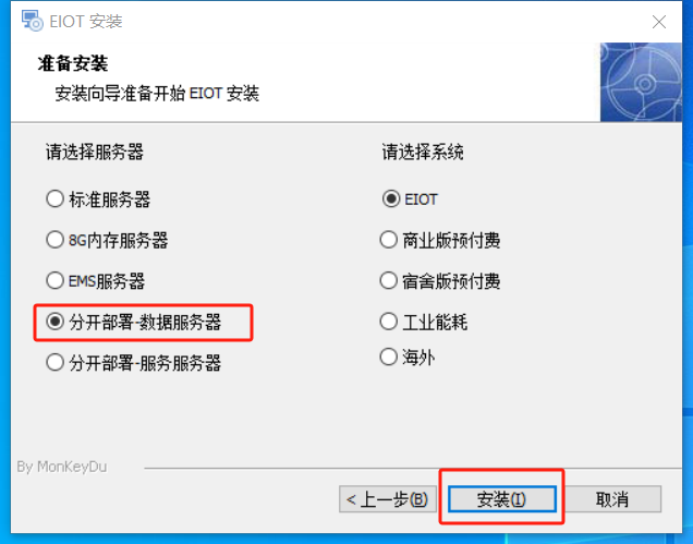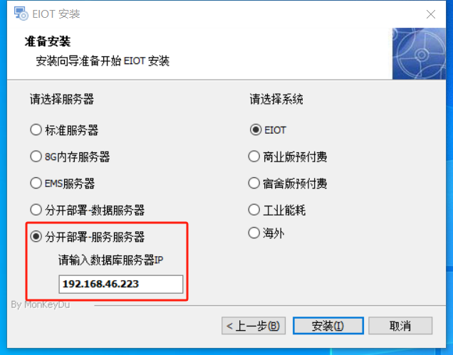 ## 启动安装向导 1、先在数据库服务器进行安装  2、后在应用服务器进行部署,输入IP地址  ## 配置文件检查 如果安装后,系统不能正常运行。则进行配置文件检查。 ### 1、启动脚本 D:\acrel-iot\bin\util 目录下的 EIOTStartUp.bat 和 ExchangeStartUp.bat 是否包含了 "--spring.databaseip=172.30.234.72" , "172.30.234.72" 未对应的数据库服务器的IP地址。 例: ```bash java -jar -Dfile.encoding=UTF-8 D:\acrel-iot\server\eiot\service-eiot-web-1.0.jar --spring.config.location=classpath:/,file:./config/ --spring.databaseip=172.30.234.72 --spring.profiles.active=prod-win ``` ### 2、后台配置文件 #### 位置 D:\acrel-iot\server\eiot\config\application-prod-win.yml #### 检查内容,确认相同 Mysql ,确认包含 ${spring.databaseip} ```yaml datasource: url: jdbc:mysql://${spring.databaseip}:13306/basic?useUnicode=true&characterEncoding=utf-8&allowMultiQueries=true&serverTimezone=Asia/Shanghai ``` MongoDB ,确认包含 ${spring.databaseip} ```yaml data: mongodb: uri: mongodb://${spring.databaseip}:27020/local?safe=true&maxPoolSize=500&minPoolSize=10 ``` Redis ,确认包含 ${spring.databaseip} `````yaml redis: # 单机模式 host: ${spring.databaseip} ````` RabbitMq (localhost 或 127.0.0.1 都可以) ```yaml # 第一段 #RabbitMQ服务器 rabbitmq: host: 127.0.0.1 #第二段 mqtt: url: tcp://127.0.0.1:30001 sendmqtt: url: tcp://127.0.0.1:30001 ``` ### 3、中台配置文件 #### 位置 D:\acrel-iot\server\exchange\config\application-prod-win.yml #### 检查内容,确认相同 Mysql ,确认包含 ${spring.databaseip} ```yaml datasource: druid: url: jdbc:mysql://${spring.databaseip}:13306/basic?useUnicode=true&characterEncoding=UTF-8&useSSL=false&serverTimezone=GMT%2B8 ``` MongoDB ,确认包含 ${spring.databaseip} ```yaml data: mongodb: uri: mongodb://${spring.databaseip}:27020/local ``` Redis ,确认包含 ${spring.databaseip} `````yaml redis: host: ${spring.databaseip} ````` RabbitMq (localhost 或 127.0.0.1 都可以) ```yaml # 第一段 #RabbitMQ服务器 rabbitmq: host: localhost #第二段 mqtt: default: url: tcp://localhost:30001 iot: url: tcp://localhost:30001 ```