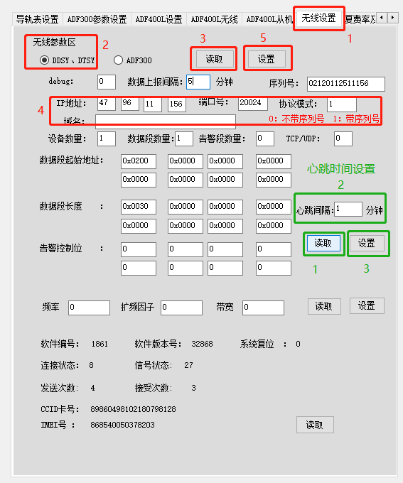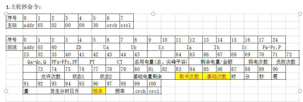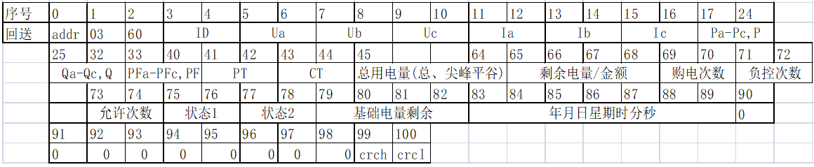 **第三方平台与4G电表(DDSY/DTSY1352/ADF300L)对接** 目录 一、 概述 2 二、 通讯测试 2 1) 服务端测试 2 2) 电表端测试 2 三、 电表协议解析 3 1、 基本格式 3 1.1 起始符结束符 4 1.2 CRC校验 4 1.3 命令描述 4 2、 通信规则及数据解析 4 1) 设备注册(0X84) 4 2) 对时命令(0X93) 5 3) 数据上报(0X91) 5 4) 数据下发(0X90) 6 5) 心跳上传 8 3、 数据上传包解析示例 8 四、 电表按键调试模式 11 1. 概述 4G电表通讯是基于TCP/IP的连接,电表做为客户端去主动连接服务端,所以对接电表数据通讯,需要将服务端的参数(IP和端口)设置到电表内。电表按照协议流程(注册->对时->上报数据->心跳包)会主动上报数据给服务端,同时建立TCP连接后,服务端可主动下发查询数据或是写入数据命令到电表。 电表主动上传数据,此版本为标准(默认)版本协议,如有特殊需求或定制功能请联系研发产品经理。 1. 通讯测试 2. 服务端测试 以固定IP为例,支持域名方式(长度不超过20字符): 服务端的端口和IP,如:IP为123.57.0.93,端口为20024  1. 电表端测试 IP和端口参数设置,如:IP为123.57.0.93,端口为20024 进入“sys”菜单下查看IP1 、IP2、port,如下图所示  按回车键“”   按回车键“”   按回车键“”  在运行状态下按向下键查看信号值“rs”与状态参数“st”如下所示:  按向下键“” 1. 电表协议解析 电表协议通讯链路是TCP/IP方式,协议格式基于winsocket方式,具体格式和解析方式如下 1. **基本格式** 起始符 {{ (2字节) 命令字(固定) (1字节) 消息体(可变) 校验位 (2字节) 结束符 }} (2字节) * 1. **起始符结束符** 以“{{“ 为帧起始 以 “}}” 为帧结束 * 1. **CRC校验** 校验位长度为2个字节,Modbus CRC校验算法 。 校验范围为命令字开始(含命令字)到消息体结束。 **注:任何与服务器进行交互的数据都需要按此格式进行编解码。(包括透传,注册等等) NB通讯设备无需进行设备注册。** * 1. **命令描述** 功能 描述 仪表请求 服务器响应 服务器下发 仪表响应 备注 1、设备注册 0x84 0x84 打开TCP连接后立即发送注册包 2、对时 0x93 0x93 仪表和服务器校时 3、Modbus 数据域上传 0x91 0x91 根据配置的数据域上传Modbus数据包 4、Modbus 数据透传 0x90 0x90 服务器下发透传命令,仪表根据Modbus命令进行响应 5、心跳上传 0x94 无需响应 1. **通信规则及数据解析** 仪表与服务器之间的通信采用一问一答方式。应答方需对消息包进行CRC校验等有效性检查,判定有效消息后才做相应应答。应答的命令字和发起方相同。应答方只做一次应答,不重复发包。 为确保消息的送达,消息发送方如果未收到消息响应,则需要在间隔一定时间后重新发送该消息,尝试两次后,如果没有响应或正确响应,则断开连接重新注册连接。 在消息重发若干次未收到应答消息,则可判定为设备离线。设备及服务器做相应处理,其中仪表在离线后需要把离线状态在设备界面显示出来。 以下以4G表DTSY1352仪表序列号(**02121031700227**)为例 1. **设备注册(0X84)** 仪表发送 命令字:**0x84** 服务器响应 命令字:**0x84** 协议描述 字段含义 字段类型 长度 描述 消息体 注册序列号 byte 20 最长20个字符,字符串以’\0’作为结束,不足补零 卡号 Byte 30 最长30个字符,字符串以'\0'作为结束,不足补零 信号强度 byte 1 1~31 RSSI信号值 固件版本1 byte(BCD) 2 当前固件版本 固件版本2 byte(BCD) 2 当前固件版本 固件版本3 byte(BCD) 2 当前固件版本 定时上传间隔 Byte 1 分钟 默认为5min ①报文举例(带序列号): **Send(65Byte):** 7b 7b 84 30 32 31 32 31 30 33 31 37 30 30 32 32 37 00 00 00 00 00 00 38 39 38 36 30 34 35 31 30 39 31 39 43 30 34 35 32 38 38 38 00 00 00 00 00 00 00 00 00 00 15 00 02 01 00 01 00 05 db 33 7d 7d **Receive:** 7b 7b 84 bf 23 7d 7d ②报文举例(不带序列号): **Send(65Byte):** 7b 7b 84 30 32 31 32 31 30 33 31 37 30 30 32 32 37 00 00 00 00 00 00 38 39 38 36 30 34 35 31 30 39 31 39 43 30 34 35 32 38 38 38 00 00 00 00 00 00 00 00 00 00 1b 00 02 01 00 01 00 1e 1a b4 7d 7d **Receive(7Byte):** 7b 7b 84 bf 23 7d 7d 1. **对时命令(0X93)** 仪表请求,命令字:**0x93** 服务器下发,命令字:**0x93** 协议描述 字段含义 字段类型 长度 描述 消息体 年 byte 1 月 byte 1 日 byte 1 星期 Byte 1 周日为0 时 Byte 1 分 Byte 1 秒 Byte 1 请求时间.. ①报文举例(带序列号): **Send(27Byte):** 7b 7b 93 30 32 31 32 31 30 33 31 37 30 30 32 32 37 00 00 00 00 00 00 6b 6c 7d 7d **Receive(14Byte):** 7b 7b 93 **15 0a 15 04 13 24 2a** 2a f0 7d 7d (**21年10月21日 周四 19点 36分42秒**)(93 **15 0a 15 04 13 24 2a**)CRC校验 ②报文举例(不带序列号): **Send(7Byte):** 7b 7b 93 ff 2d 7d 7d **Receive(14Byte):** 7b 7b 93 **15 0a 15 04 13 18 23** fb f6 7d 7d (**21年10月21日 周四 19点 24分35秒**)(93 **15 0a 15 04 13 18 23**)CRC校验 1. **数据上报(0X91)** 仪表发送Modbus数据流:命令字:**0x91** 服务器响应: 命令字 :**0x91** 协议描述 字段含义 字段类型 长度 描述 消息体 如下 例:[[adr-1((01100000000crc))]][[adr-2((01100000000crc))]][[adr-3((un))]] ①报文举例(带序列号): 7b 7b 91 A1-A20 [[adr-1((modbus数据流))]]crc 7d 7d 备注:A1-A20为网关序列号 adr为仪表地址 A15-A20不足补零 **Send(139Byte):** 7b 7b 91 30 32 31 32 31 30 33 31 37 30 30 32 32 37 00 00 00 00 00 00 5b 5b 31 2d 31 28 28 01 03 60 00 05 09 3e 00 00 00 00 00 00 00 00 00 00 00 00 00 00 00 00 00 00 00 00 00 00 00 00 00 00 03 e8 03 e8 03 e8 03 e8 00 01 00 05 00 00 00 00 00 00 00 00 00 00 00 00 00 00 00 00 00 00 00 00 00 01 86 a0 00 01 00 00 00 00 00 08 0f 7f 00 00 00 00 15 0a 15 04 13 25 01 00 00 00 00 00 00 00 00 00 2e 14 29 29 5d 5d c0 84 7d 7d **Receive(7