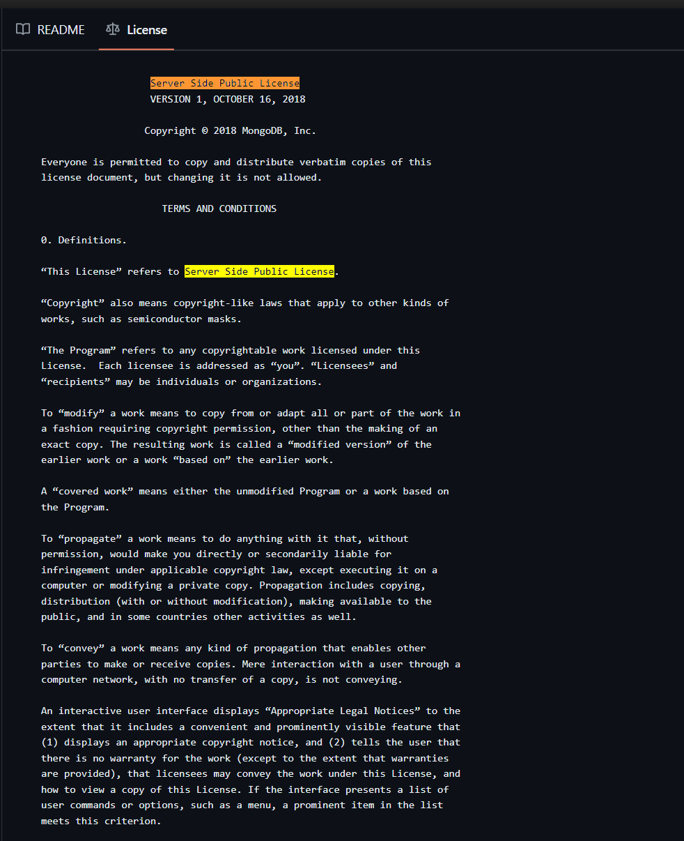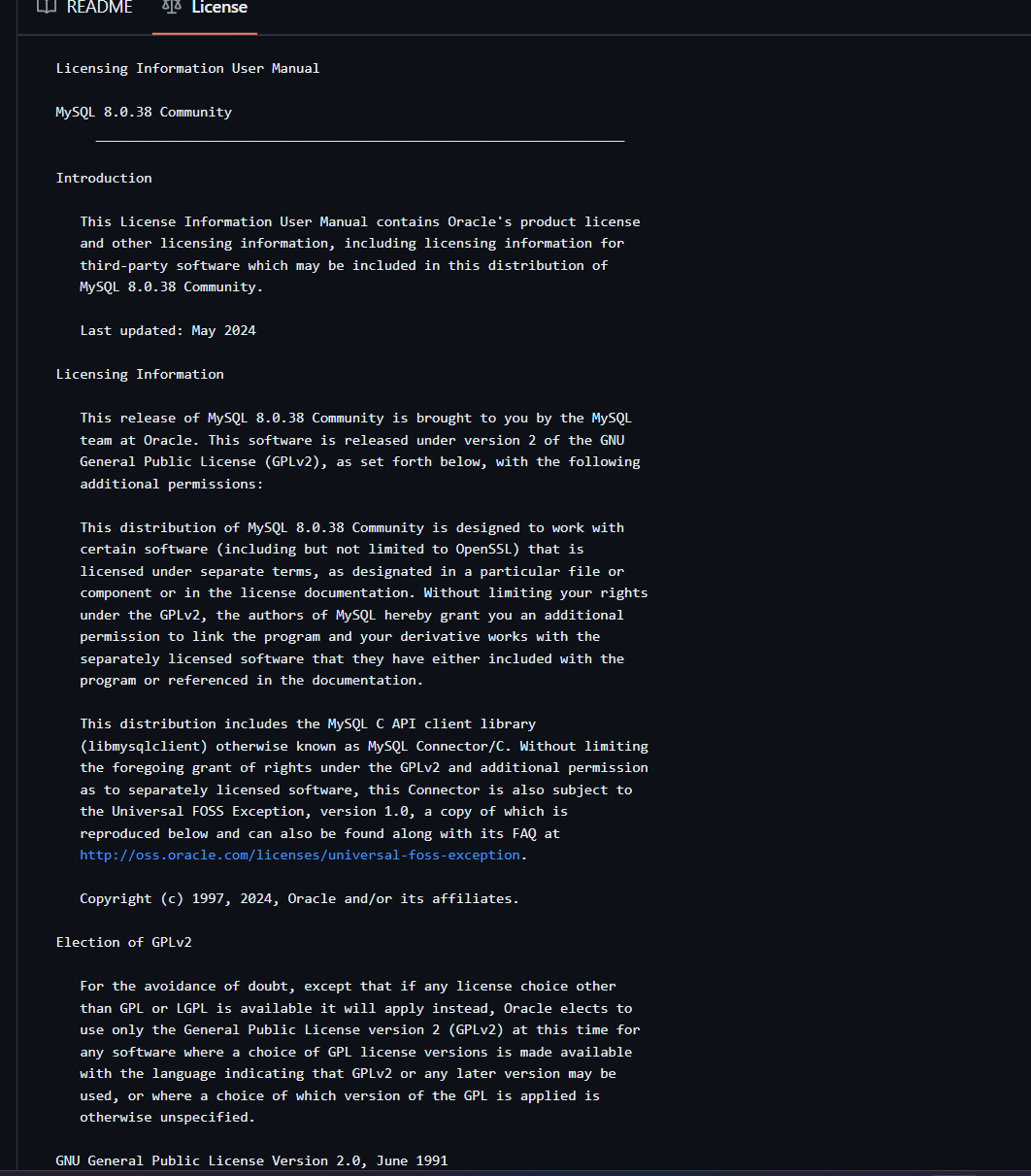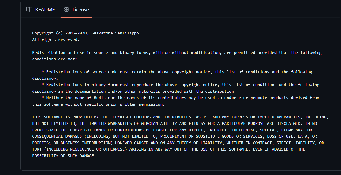 # Mysql MySQL 是在 GNU 通用公共许可证(GNU General Public License,简称 GPL)下发布的。这意味着其源代码是公开的,并且可以自由分发和修改。具体来说,MySQL 使用的是 GPL 2.0 版本。GPL 许可证是一个非常著名的开源许可证,它确保软件的源代码是公开的,并且允许用户自由地使用、修改和分发代码。 Git license截图:  # Mongodb MongoDB 的源代码现在是根据 Server Side Public License (SSPL) 许可发布的,SSPL 是一个源自 GNU GPL 的许可证。 Git license截图:  # Redis Git license截图: