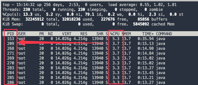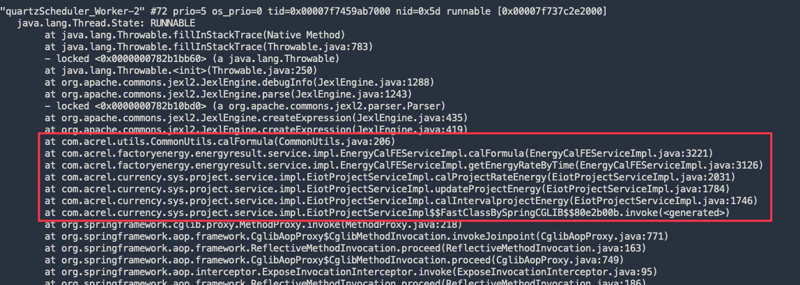 1. 进容器,service-eiot-web是容器名,可以通过docker ps命令查看 ``` docker exec -it service-eiot-web bash ``` 2. 查看线程CPU,容器里面的的java进程号一般都是1 ``` top -p 1 -H ``` 3. 看哪个占用CPU高,要多观察一会儿,把CPU占用长时间较高的PID记录下来  4. 把占用CPU高的PID转为16进制,比如PID=179,对应16进制是b3,所以nid就是0xb3 转换16进制可以用科学计算器,或者在这个网址进行 https://it-tools.tech/base-converter 5. 用jstack命令查看堆栈信息 ``` jstack 1 | grep -A 100 nid=0xb3 ``` 6. 一般堆栈信息有可能出现两种情况: - GC线程导致CPU占用高,一般这是因为服务器物理内存或者JVM堆内存不足导致,需要进一步排查堆内存占用情况,可以用jmap和jstat命令 简单用法可以看这个贴:http://47.96.11.156:50001/doc/13/ 具体用法百度  - 应用程序的线程导致CPU占用高,可以直接在堆栈信息中搜索com.acrel,可以看到出问题的类,类似下图的堆栈信息