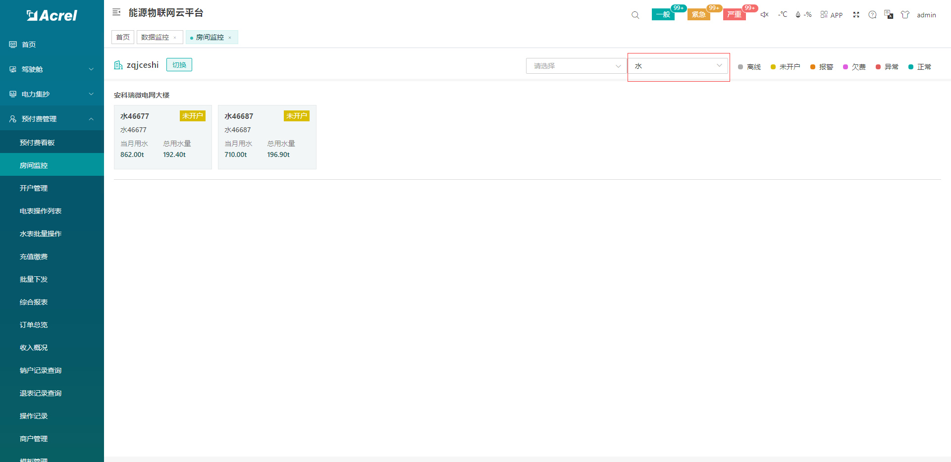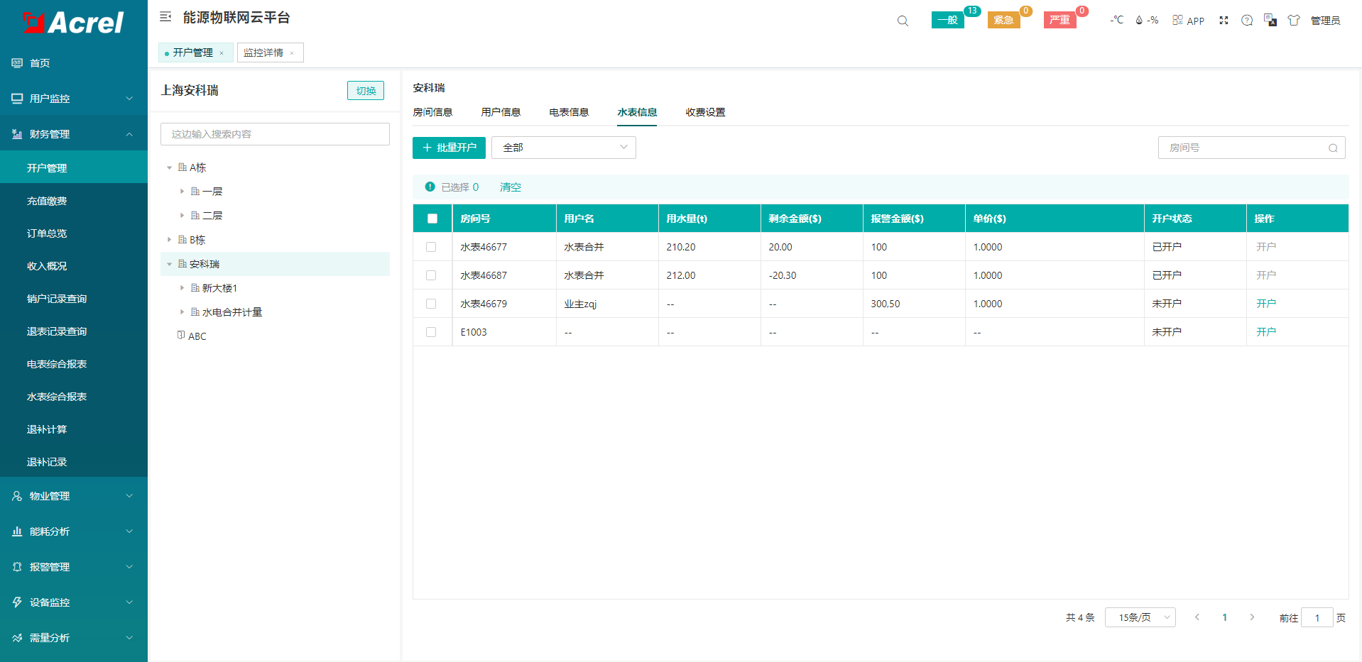 ## **常见问题** ### 1、系统首次使用操作流程 ### 2、商铺/用户录入、首充流程 ### 3、日常充值流程 ## **操作指引** ### 系统首次使用操作流程 首次使用系统需确认本项目电价方案,在系统设置对应电价方案。 流程步骤如下:物业管理-->收费方案设置-->添加电价方案 **** 方案名称 :项目电价名称 允许赊欠金额:允许欠费用电的额度(设置100元表示金额为-100元跳闸) 是否复费率 :项目采用单一电价还是多费率电价 尖--深谷电价 :电价设置(如1.0000元/度,最多4位小数) ### 开户(商铺/用户录入)/首充流程 租户首次进行充值需进行开户操作,确认录入用户名、用户电话等租户信息及电价、首充金额的电费信息。 流程步骤如下:财务管理-->用户管理-->电表信息-->开户  开户需确认/输入用户、联系电话、电价方案、充值金额及开户前金额处理方式。  用户 :商铺名称或者租户名(必填) 联系电话:联系方式(选填) 电价方案:可直接选择已录入电价方案。**电价务必确认正确,否则影响计费!!!** 累计电量:电表当前电能度数 充值金额:用户充值金额 用电金额处理方式(开户前):新装电表至租户开户期间电表电能处理方案选择。选择清零实到金额=输入金额,选择累充值实到金额=输入金额-(电能*电价) ### 日常充值流程 进入用户监控-->房间监控,选择要操作的房间进入监控详情:  点击售电进行操作:  输入支付金额,选择付款方式,点击确认完成充值:  ## 首页 首页展示水电实时状态信息、报警信息、月收入占比情况、销售类型收入情况、当日用电用水情况等直观信息,可点击主要功能快捷入口进入相应界面,包括新增开户、订单总览,电表批量操作,水表批量操作,能耗分析,房间监控。  ## 用户监控 ### 房间监控 展示项目所有仪表/房间/用户名、今日耗电、剩余金额以及实时状态信息,用户可以通过选择仪表对应房间,进入监控详情页面,对单个仪表/房间/用户进行实时监控:  能源类型切换至水,可查看水表对应信息:  ### 监控详情 展示每个仪表/房间/用户的剩余金额,分合闸状态,电价,累计购电次数,累计充值金额等信息;可对该房间进行开户、已开户房间退表、电价设置、售电、退电、报警设置、强制分合闸、恢复预付费操作,也可查看该房间的“用能信息”,“订单信息”,“账单信息”,“报警信息”,“电参量”相关信息。用能信息,通过柱状图分时段展示尖峰平谷用能,总用电量、总使用金额、当天用电量等信息:  #### 订单信息 展示该房间当前用户下当月的订单信息,用户可进行订单收据打印操作:  #### 账单信息 展示该房间开户或通过收费设置的物业费收取方案选择生成缴费账单,进行线下收费的账单信息:  #### 报警信息 用户可查看该房间仪表金额、设备状态异常等报警历史记录:  #### 电参量 展示当前电表实时电参量信息,以及历史电参量曲线:  ## 财务管理 ### 开户管理 管理项目水电表、房间及用户的对样信息,可进行新用户的开户接入,也可进行老用户信息更改: **** 电表信息、水表信息:项目调试阶段调试导入。 房间信息:项目实际的房间名称信息,每个房间可本绑定一块水表、一块电表。 用户信息:项目实际的租户名称,一个租户可绑定多个房间,多个房间统一充值计费。  #### 房间信息 可根据项目实际的房间名称将水电表与房间名称进行绑定,方便后续管理工作,每个房间可绑定一个电表、一个水表,点击选择框可选择添加。房间信息可在项目前期调试阶段整理导入,也可后期管理人员自己新建更改:  房间面积:可用于按照房间面积扣除服务费 最大容量:可用用于按照容量进行扣费 容量/需量单价:可用用于按照容量/需量进行扣费 #### 用户信息(一户多表) 可根据项目实际的租户名称将租户与房间名称进行绑定,方便后续管理工作,每个租户可绑一个或多个房间,一个租户下多个房间可选择合并计量(开户后多个房间水电共用一个账户扣费):  #### 电表信息(开户) 在房间信息、用户信息中绑定电表与用户信息后,可在电表信息界面进行统一开户: 一户多表合并计量的用户,每块电表充值金额都会计入合并计量余额中,合并计量余额欠费后多个电表统一跳闸:  #### 水表信息(开户) 水表开户逻辑及开户流程与电表一致:  #### 收费设置(物业费) 收费设置提供“物业费收取方案的设置”的功能: 房间号 :需要收取物业费房间,可批量选择项目中房间。 扣费方式:直接扣费(在当前余额中直接扣除物业费);生成缴费账单(仅生成缴费账单,租户可在公众号中查询/支付。需开通微信支付功能)  收费类型:周期性收费(可在设置周期内,按照设置扣费日期,定时扣费);一次性收费(仅扣除一次) ### 订单总览 展示所选项目下所有用户的当月订单信息,可根据日期,用户名,订单类型,支付方式,销售类型进行查询,同时提供“导出报表”,“审核”,“批量审核”,“下载导入充值模板”,“导入充值”,“单据打印”,“操作失败订单重新下发”的功能。  #### 收据打印 选择一条订单,点击收据打印,收据打印模板如图所示:  ### 收入概况 展示每个房间不同收入方式获取的收入情况,用户可选择类型(电,水,其他)、日期、房间号进行查询,收入类型有四种类型,包括现金、支付宝、微信、其他:  ### 综合报表 根据时间段、房间、用户名,查询用电、用水使用情况:  提供“导出报表”,“用电单据打印”的功能:  ## 物业管理