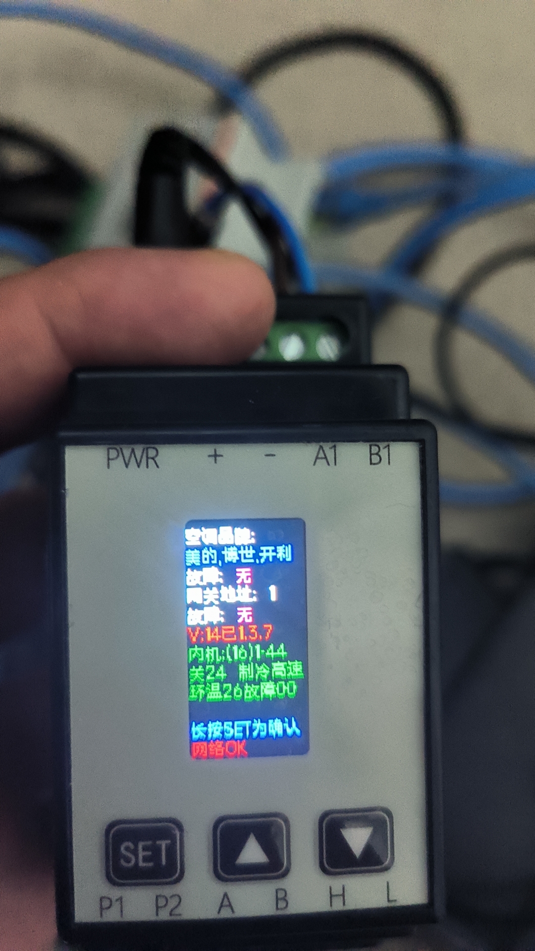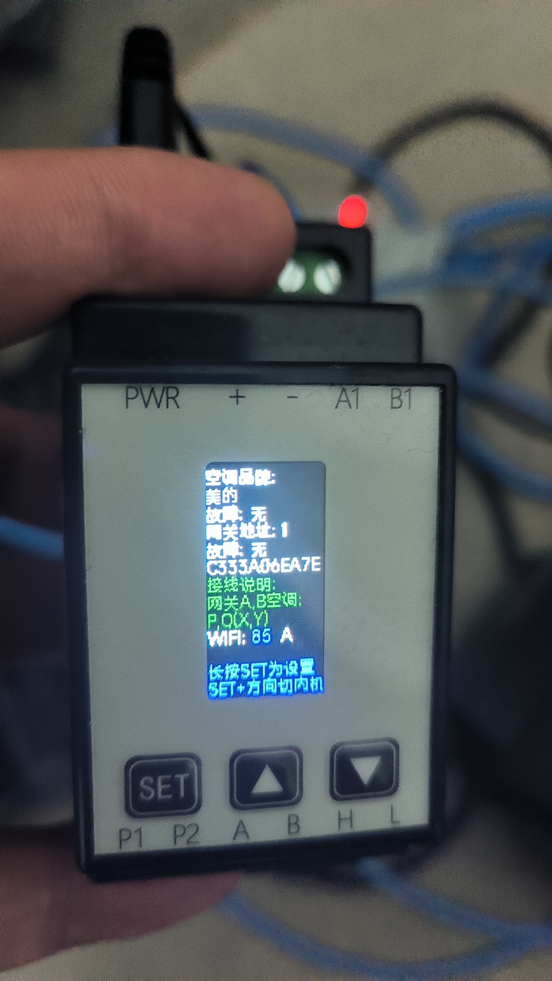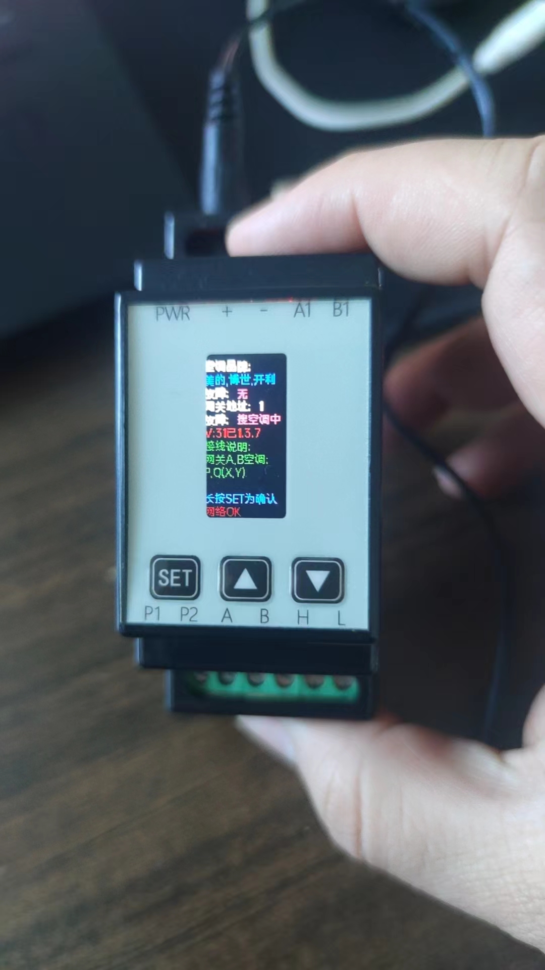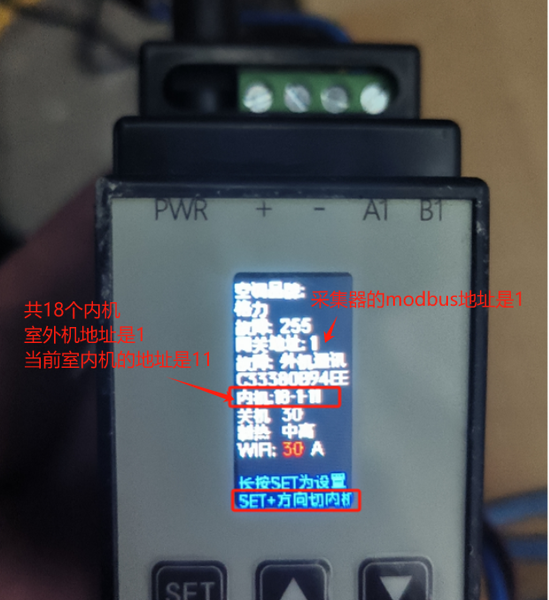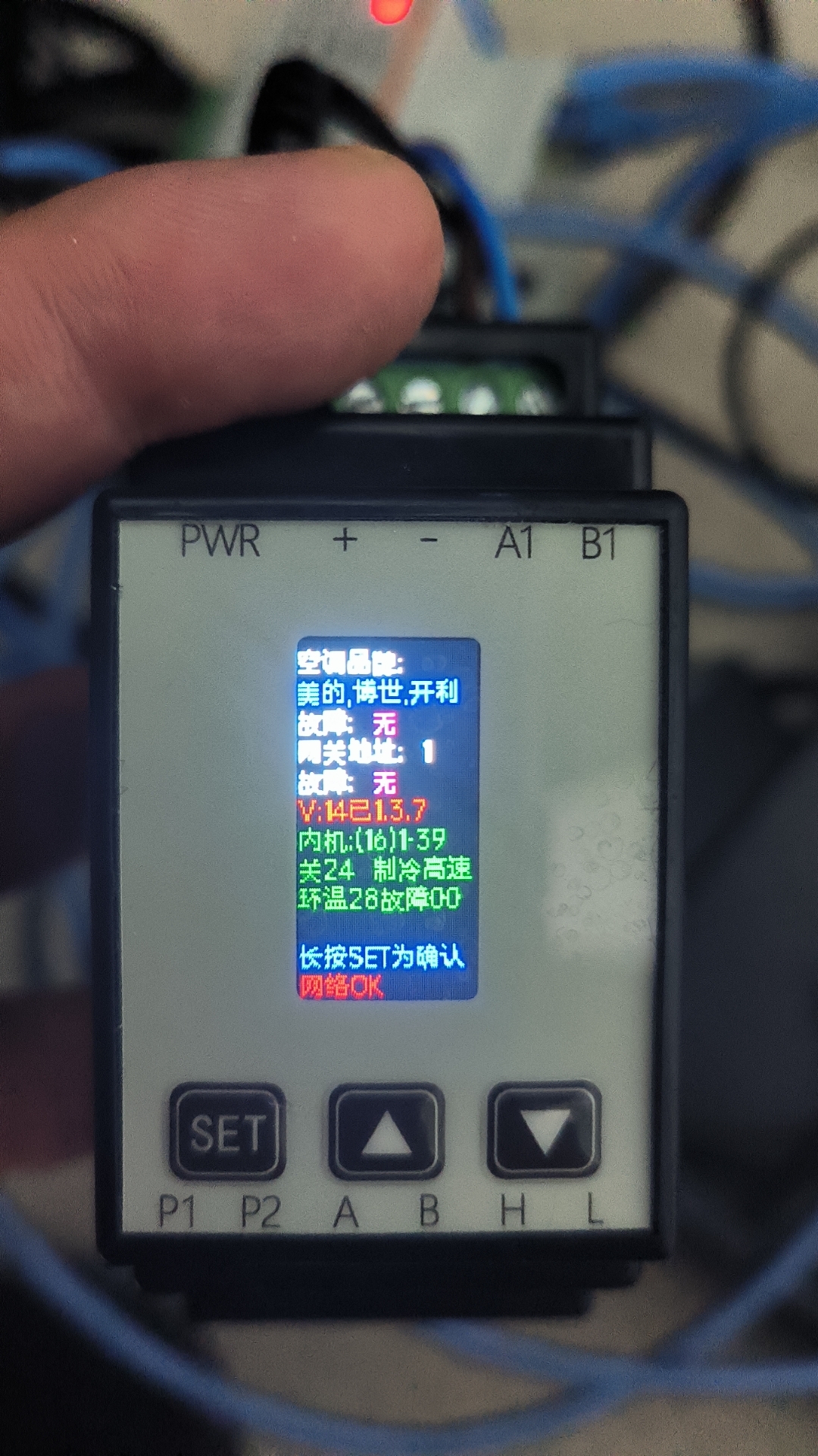 ### 1.方案介绍   海镕多联机空调控制器目前使用AWT200网关中台协议或ANet网关运维协议接入EIOT平台,一个海镕空调控制器只接一个室外机制冷系统,网关可以接多个海镕空调控制器。由海镕多联机空调控制器采集现场空调系统的数据,安科瑞网关根据抄表模板去采集并拆分各室内机回路的数据,每台室内机回路作为一个单独的空调子设备。   平台型号名称的**前缀**暂定为`HRJN-2020D`,与海镕分体空调面板`HRJN-2020C`作区分,根据现场室外机地址是1还是0确定型号名称**后缀**。 - `HRJN-2010D_0_64`对应室外机地址0,下面内机地址0~63,共64个,应该不常见 - `HRJN-2010D_1_64`对应室外机地址1(常用),下面内机地址0~63,共64个    海镕多联机空调控制器能够搜索到下面接的空调室内机 如空调控制器上`18-1-11`前面的`18`表示整个空调系统共有18台室内机,后面`1-11`表示室外机地址1下的地址11的室内机,虽然能够搜索到室内机地址,但是不能根据室内机地址确定到底是哪个房间的空调,需要现场通过开关机、设置参数对照平台上的数据变化,确认室内机地址和室内机的对应关系(操作示例见下文3.3)。 - 需要注意:多联机空调属于一个制冷系统,制冷模式和制热模式不能共存,已经有室内机开启制冷模式的情况下,其他的室内机开启制热模式是不生效的,其余的模式没有这种冲突,唯有制冷和制热不能共存。 平台下发开关设置、运行设置指令中台这边是通过透传方式下发到空调控制器。 #### 1.1 格力机组和美的机组调试过程(仅供参考可略过不看)   某项目现场有格力和美的两套机组,空调控制器最初使用的是海镕提供的V1.20(2022年)协议,协议规定一个室外机下最多有32个室内机,室内机地址范围是0 ~ 31。根据此协议为室外机地址1的场景编写了`HRJN-2010D`型号模板,下面带内机地址0 ~ 31共32回路。   格力机组顺利调通后接下来调试美的机组时出现问题,现场美的机组各室内机的地址不在0 ~ 31范围内,导致现有的协议用不了,并且无法通过美的的空调面板去改写室内机地址。   后来和海镕技术沟通,对方提供了一版新的V2.1协议,单个室外机地址下支持64台室内机,室内机地址范围:0 ~ 63,现场空调控制器需要升级固件。   现场美的机组控制器如下图所示,室外机地址是1,下面共16台室内机,其中这一个室内机地址是58,这种情况须使用新的型号模板`HRJN-2010D_1_64`   如果室外机地址是0的话,须使用`HRJN-2010D_0_64`模板(这种情况应该很少,海镕技术说过一般室外机地址默认是1),所以常用的应该只有`HRJN-2010D_1_64`这个型号模板。   调试前先确认海镕发的货用的是什么程序版本,如果是老版32路协议的版本,需要升级最新的64路协议的程序,升级步骤见下文2.1。   从空调控制器界面上看就可以很清楚的区分新版程序还是老版程序,如下图所示。 老版,界面颜色略显单调。  新版,内机地址和状态用绿色显示。  ### 2.海镕空调控制器使用说明 一个空调控制器下面只接一个制冷系统(室外机),室外机地址从0开始,空调控制器能够查看到制冷系统(室外机)下的空调室内机地址,但是不能和现场每一台室内机一一对应,调试完网关并在平台添加绑定各台室内机后需要现场的人配合,通过开关机、设置参数等操作去看平台上的数据变化,确定室内机回路地址和所在房间位置的对应关系 以旧版32回路程序为例,空调控制器上内机`18-1-11`前面的18表示共有18台室内机,后面1-11表示室内机地址,对应室外机地址1下的地址11的室内机,如下如所示  新版本界面有所变化,如下图所示,图中搜索到的内机地址是1-44,共16台室内机  #### 2.1 海镕空调控制器联网升级固件版本 海镕空调控制器联网后可以在线升级到最新程序版本  第一步,手机开热点,热点名称设为A,热点密码改为12345678  第二步,先拿掉A1B1线,设备重新断电上电,若设备未连上热点,重复断电上电操作,直到出现下图状态  第三步,在网络OK的情况下,按上下翻页,找到检查更新页面,长按SET确认更新下  第四步,下图V31版本正在下载中,这时候不要动设备也不要断电,等待设备更新直到版本显示V31即可,若升级失败,重复下第三步的操作  第五步,升级成功后界面如下图所示,搜索空调完成后可以按上下键统计内机地址  ### 3.调试说明 #### 3.1 AWT200网关方案调试说明(此方案没有锁定功能) ##### 3.1.1 注意事项 (1)由于AWT200目前的模板点位数上限是600个,多联机空调控制器的锁定功能(开关锁定、模式锁定、温度上下限锁定、风速锁定)此方案暂不支持,因为点位不够用,项目上若需要锁定功能,须使用ANet网关。 (2)使用AWT200网关接入,一个室内机在EIOT平台的仪表地址addr是由`串口号_空调控制器Modbus地址_回路号`组成,如: `0_5_1`,表示空调控制器接在AWT200网关第一个串口下,空调控制器的modbus地址是5,这台室内机的回路号(对应型号模板里的组号)是1。由于室内机地址从0开始递增,而AWT200网关模板里的组号是从1开始,所以平台上看到的室内机的回路号需要减去1才对应室内机实际地址,`0_5_1`这台室内机实际地址是0。 (3)由于新版的HRJN-2010D_1_64型号模板采集点位数达到了512个,而AWT200网关旧版本模板点位数上限达不到这个数量,需要升级网关固件版本从而支持模板上限达到600个点位数,目前项目现场测通的固件版本是`2579_1016_AWT200_V1.8.23.C_20240329_090939.bin` 后续使用的AWT200网关固件版本不能低于