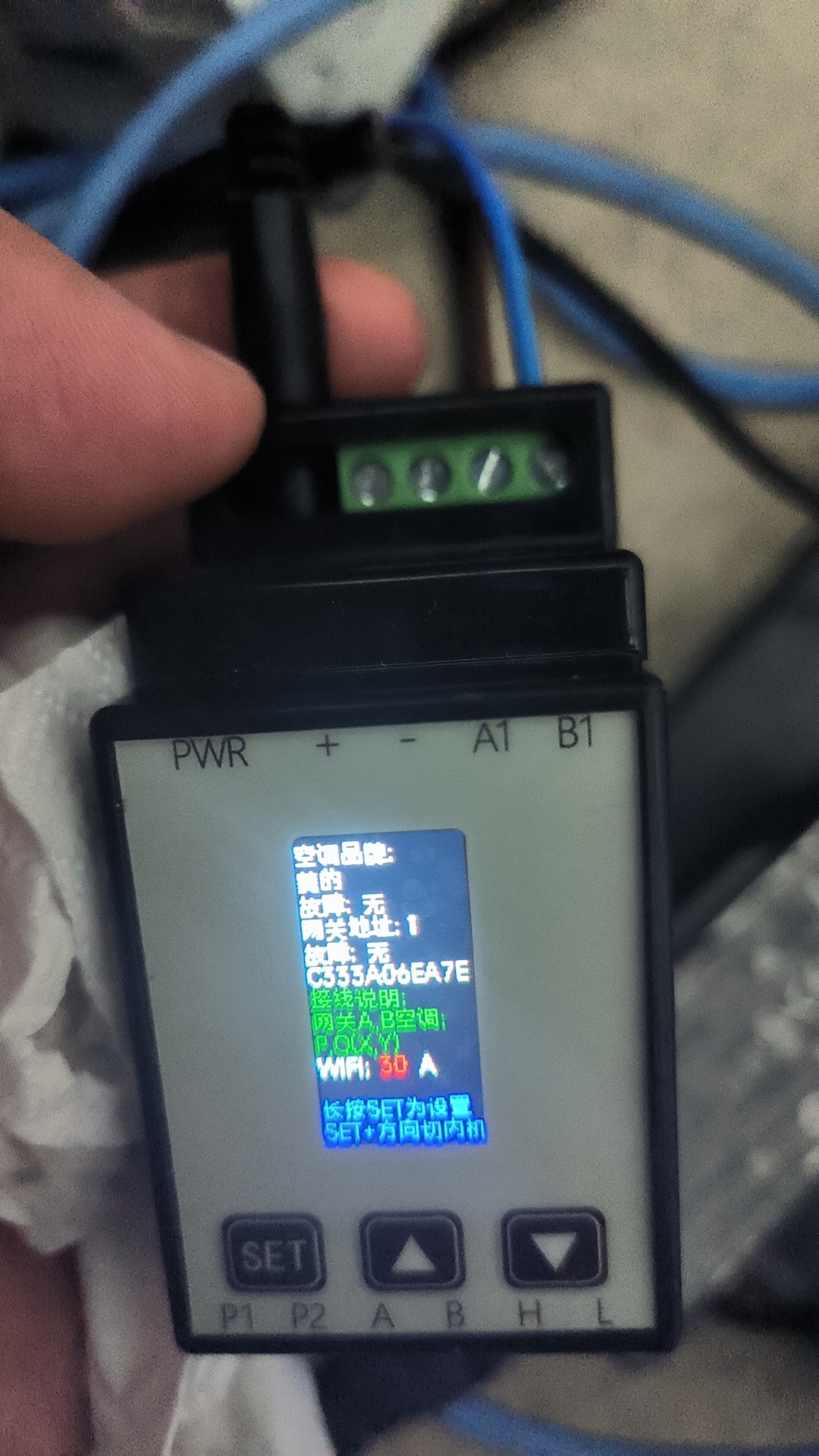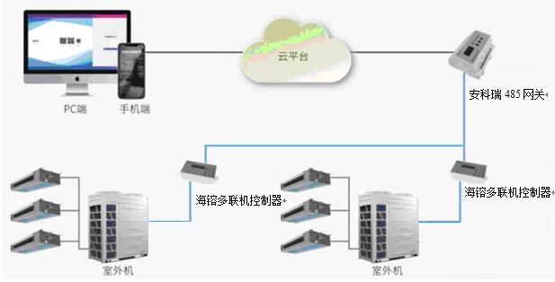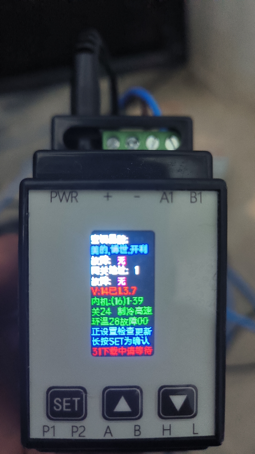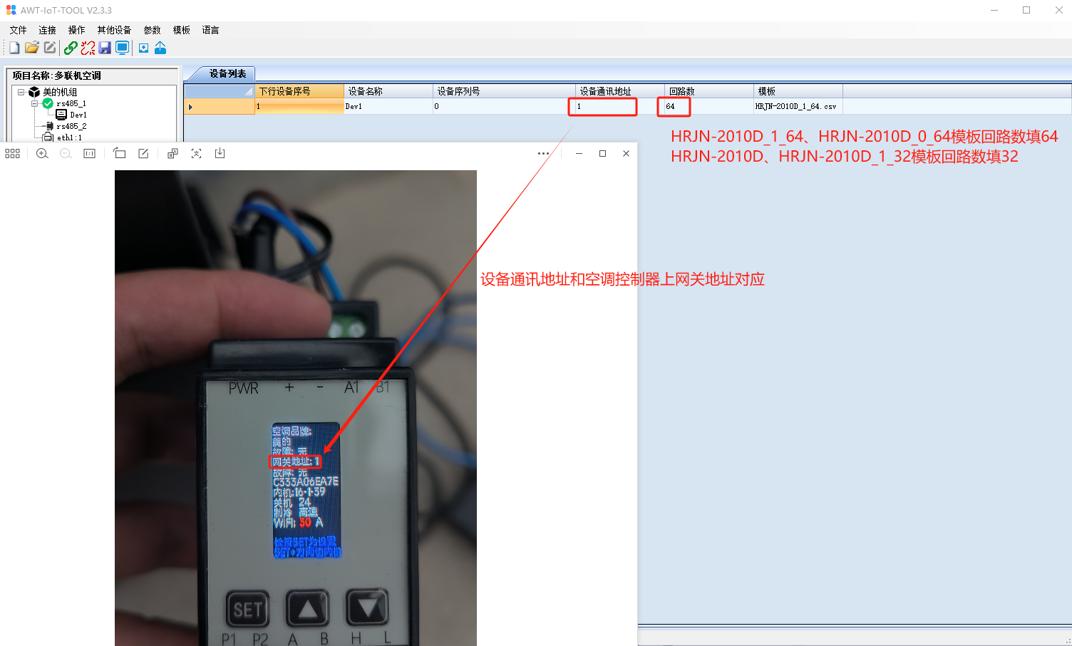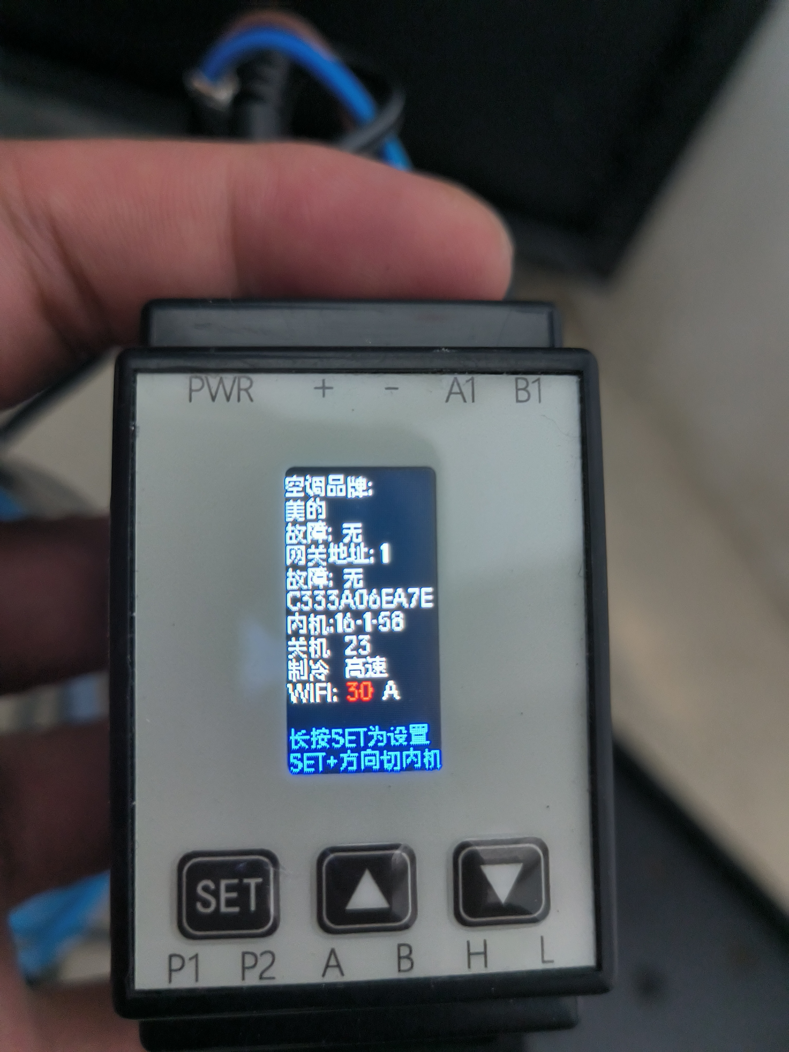 ### 1.方案介绍   海镕多联机空调控制器目前使用AWT200网关中台协议或ANet网关运维协议接入EIOT平台,一个海镕空调控制器只接一个室外机制冷系统,网关可以接多个海镕空调控制器。由海镕多联机空调控制器采集现场空调系统的数据,安科瑞网关根据抄表模板去采集并拆分各室内机回路的数据,每台室内机回路作为一个单独的空调子设备。   平台型号名称的**前缀**暂定为`HRJN-2020D`,与海镕分体空调面板`HRJN-2020C`作区分,根据现场室外机地址是1还是0确定型号名称**后缀**。 - `HRJN-2010D_0_64`对应室外机地址0,下面内机地址0~63,共64个,应该不常见 - `HRJN-2010D_1_64`对应室外机地址1(常用),下面内机地址0~63,共64个    海镕多联机空调控制器能够搜索到下面接的空调室内机 如空调控制器上`18-1-11`前面的`18`表示整个空调系统共有18台室内机,后面`1-11`表示室外机地址1下的地址11的室内机,虽然能够搜索到室内机地址,但是不能根据室内机地址确定到底是哪个房间的空调,需要现场通过开关机、设置参数对照平台上的数据变化,确认室内机地址和室内机的对应关系(操作示例见下文3.3)。 - 需要注意:多联机空调属于一个制冷系统,制冷模式和制热模式不能共存,已经有室内机开启制冷模式的情况下,其他的室内机开启制热模式是不生效的,其余的模式没有这种冲突,唯有制冷和制热不能共存。 平台下发开关设置、运行设置指令中台这边是通过透传方式下发到空调控制器。 #### 1.1 格力机组和美的机组调试过程(仅供参考可略过不看)   某项目现场有格力和美的两套机组,空调控制器最初使用的是海镕提供的V1.20(2022年)协议,协议规定一个室外机下最多有32个室内机,室内机地址范围是0 ~ 31。根据此协议为室外机地址1的场景编写了`HRJN-2010D`型号模板,下面带内机地址0 ~ 31共32回路。   格力机组顺利调通后接下来调试美的机组时出现问题,现场美的机组各室内机的地址不在0 ~ 31范围内,导致现有的协议用不了,并且无法通过美的的空调面板去改写室内机地址。   后来和海镕技术沟通,对方提供了一版新的V2.1协议,单个室外机地址下支持64台室内机,室内机地址范围:0 ~ 63,现场空调控制器需要升级固件。   现场美的机组控制器如下图所示,室外机地址是1,下面共16台室内机,其中这一个室内机地址是58,这种情况须使用新的型号模板`HRJN-2010D_1_64`   如果室外机地址是0的话,须使用`HRJN-2010D_0_64`模板(这种情况应该很少,海镕技术说过一般室外机地址默认是1),所以常用的应该只有`HRJN-2010D_1_64`这个型号模板。   调试前先确认海镕发的货用的是什么程序版本,如果是老版32路协议的版本,需要升级最新的64路协议的程序,升级步骤见下文2.1。   从空调控制器界面上看就可以很清楚的区分新版程序还是老版程序,如下图所示。 老版,界面颜色略显单调。  新版,内机地址和状态用绿色显示。  ### 2.海镕空调控制器使用说明 一个空调控制器下面只接一个制冷系统(室外机),室外机地址从0开始,空调控制器能够查看到制冷系统(室外机)下的空调室内机地址,但是不能和现场每一台室内机一一对应,调试完网关并在平台添加绑定各台室内机后需要现场的人配合,通过开关机、设置参数等操作去看平台上的数据变化,确定室内机回路地址和所在房间位置的对应关系 以旧版32回路程序为例,空调控制器上内机`18-1-11`前面的18表示共有18台室内机,后面1-11表示室内机地址,对应室外机地址1下的地址11的室内机,如下如所示  新版本界面有所变化,如下图所示,图中搜索到的内机地址是1-44,共16台室内机  #### 2.1 海镕空调控制器联网升级固件版本 海镕空调控制器联网后可以在线升级到最新程序版本  第一步,手机开热点,热点名称设为A,热点密码改为12345678  第二步,先拿掉A1B1线,设备重新断电上电,若设备未连上热点,重复断电上电操作,直到出现下图状态  第三步,在网络OK的情况下,按上下翻页,找到检查更新页面,长按SET确认更新下  第四步,下图V31版本正在下载中,这时候不要动设备也不要断电,等待设备更新直到版本显示V31即可,若升级失败,重复下第三步的操作  第五步,升级成功后界面如下图所示,搜索空调完成后可以按上下键统计内机地址  ### 3.调试说明 #### 3.1 AWT200网关方案调试说明(此方案没有锁定功能) ##### 3.1.1 注意事项 (1)由于AWT200目前的模板点位数上限是600个,多联机空调控制器的锁定功能(开关锁定、模式锁定、温度上下限锁定、风速锁定)此方案暂不支持,因为点位不够用,项目上若需要锁定功能,须使用ANet网关。 (2)使用AWT200网关接入,一个室内机在EIOT平台的仪表地址addr是由`串口号_空调控制器Modbus地址_回路号`组成,如: `0_5_1`,表示空调控制器接在AWT200网关第一个串口下,空调控制器的modbus地址是5,这台室内机的回路号(对应型号模板里的组号)是1。由于室内机地址从0开始递增,而AWT200网关模板里的组号是从1开始,所以平台上看到的室内机的回路号需要减去1才对应室内机实际地址,`0_5_1`这台室内机实际地址是0。 (3)由于新版的HRJN-2010D_1_64型号模板采集点位数达到了512个,而AWT200网关旧版本模板点位数上限达不到这个数量,需要升级网关固件版本从而支持模板上限达到600个点位数,目前项目现场测通的固件版本是`2579_1016_AWT200_V1.8.23.C_20240329_090939.bin` 后续使用的AWT200网关固件版本不能低于