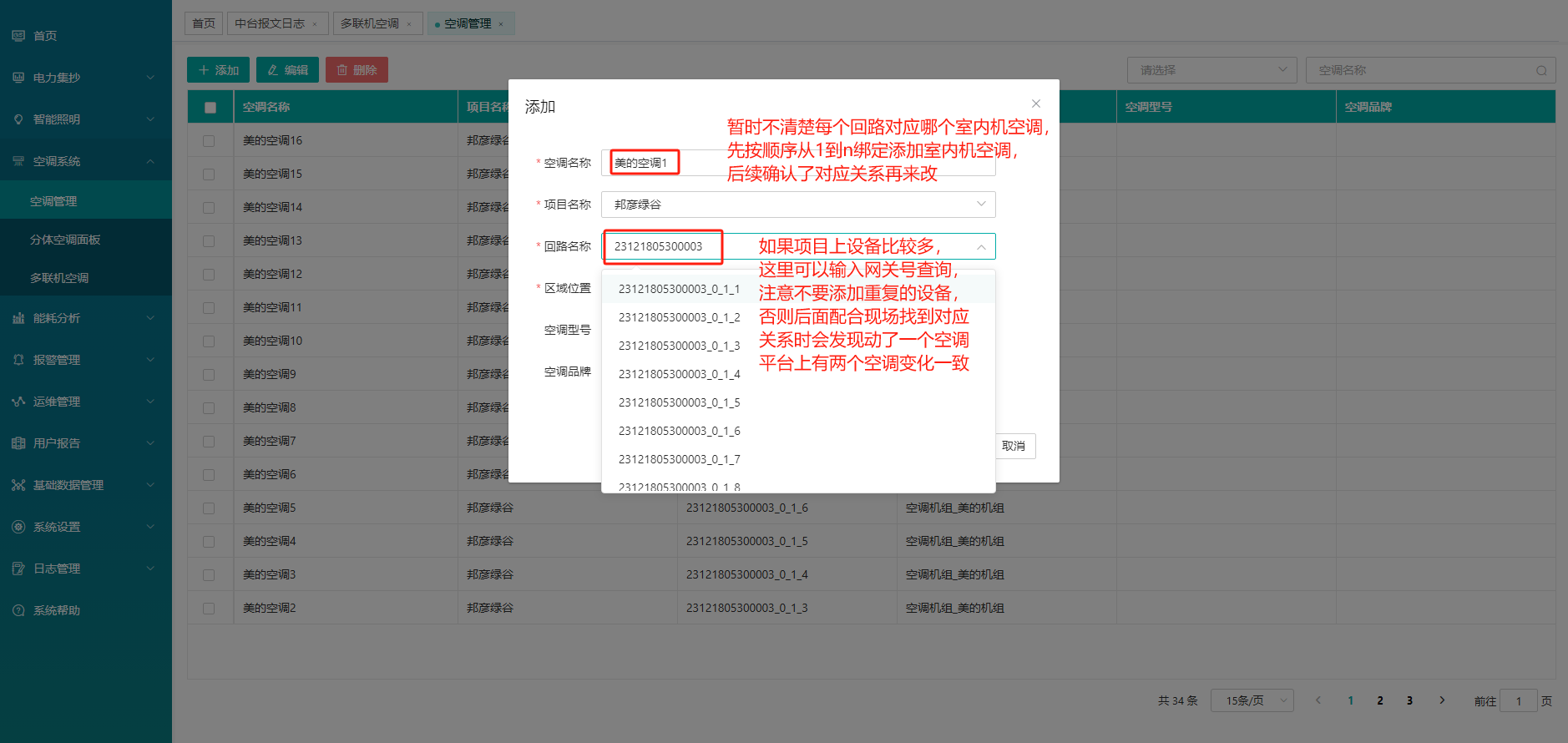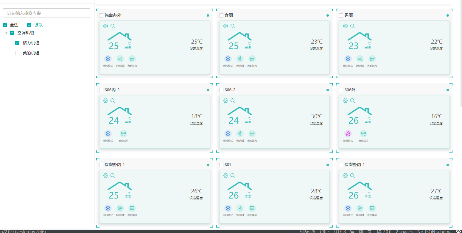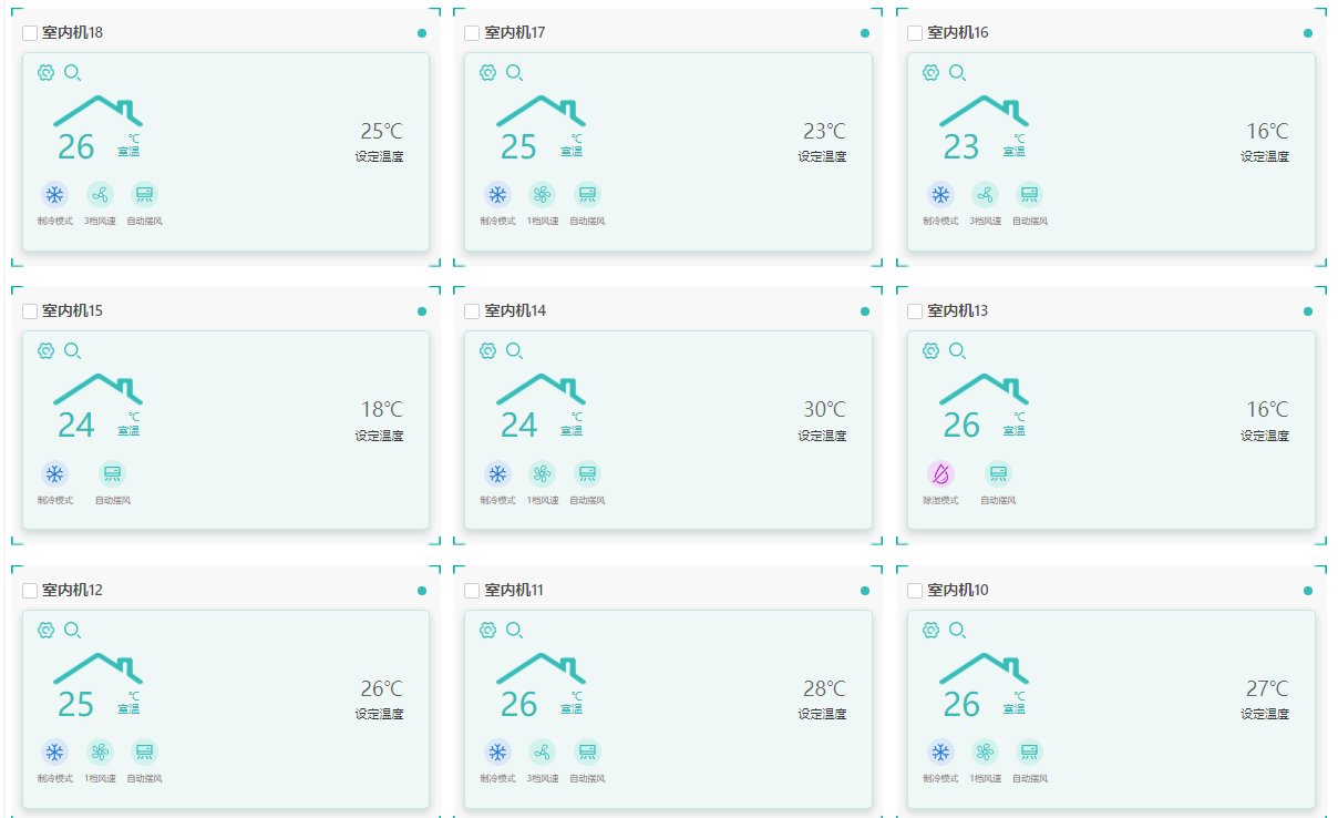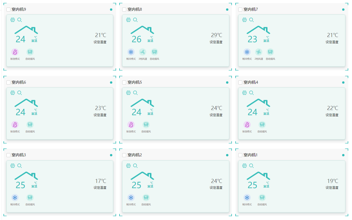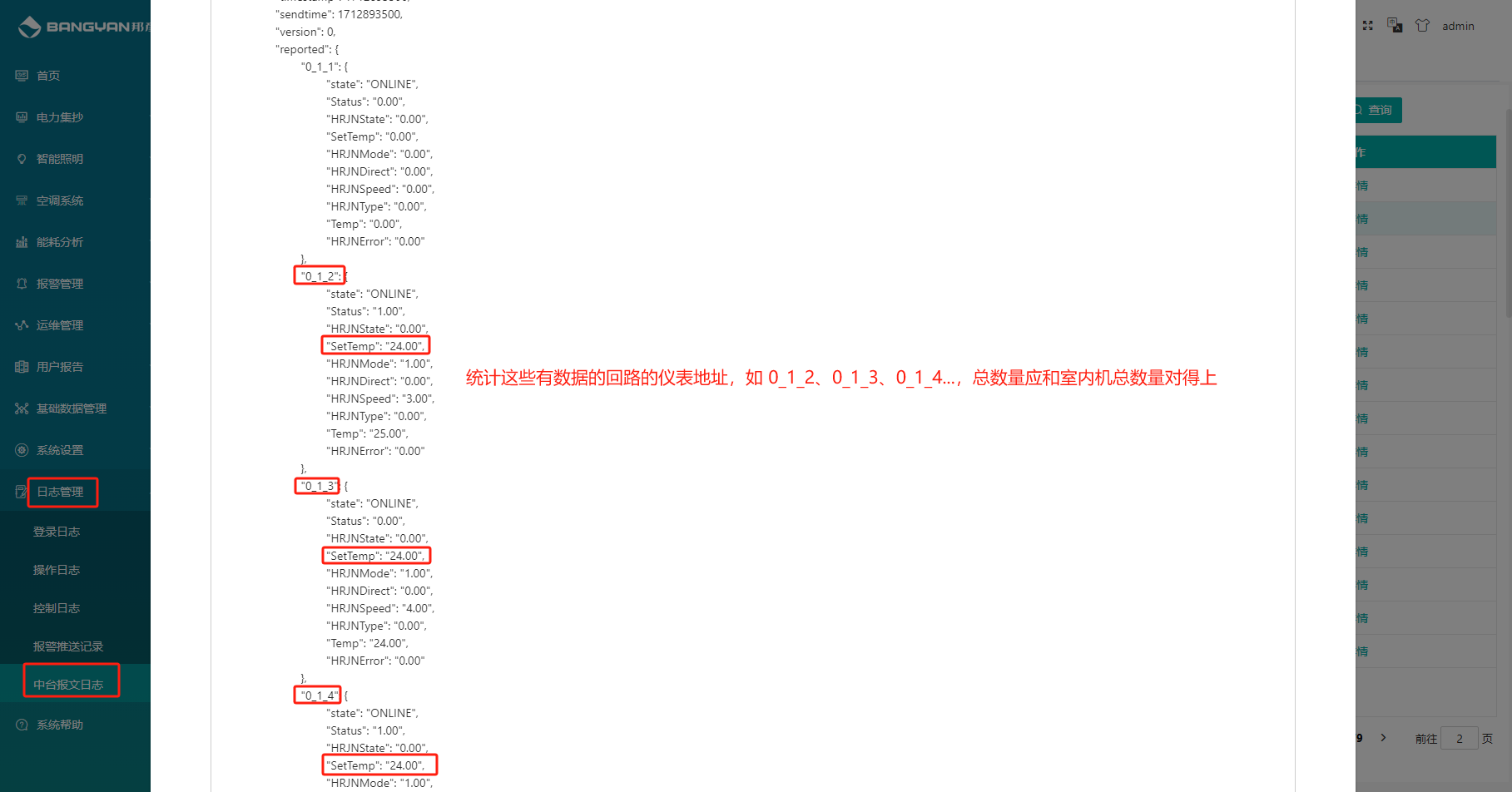 ### 1.方案介绍   海镕多联机空调控制器目前使用AWT200网关中台协议或ANet网关运维协议接入EIOT平台,一个海镕空调控制器只接一个室外机制冷系统,网关可以接多个海镕空调控制器。由海镕多联机空调控制器采集现场空调系统的数据,安科瑞网关根据抄表模板去采集并拆分各室内机回路的数据,每台室内机回路作为一个单独的空调子设备。   平台型号名称的**前缀**暂定为`HRJN-2020D`,与海镕分体空调面板`HRJN-2020C`作区分,根据现场室外机地址是1还是0确定型号名称**后缀**。 - `HRJN-2010D_0_64`对应室外机地址0,下面内机地址0~63,共64个,应该不常见 - `HRJN-2010D_1_64`对应室外机地址1(常用),下面内机地址0~63,共64个    海镕多联机空调控制器能够搜索到下面接的空调室内机 如空调控制器上`18-1-11`前面的`18`表示整个空调系统共有18台室内机,后面`1-11`表示室外机地址1下的地址11的室内机,虽然能够搜索到室内机地址,但是不能根据室内机地址确定到底是哪个房间的空调,需要现场通过开关机、设置参数对照平台上的数据变化,确认室内机地址和室内机的对应关系(操作示例见下文3.3)。 - 需要注意:多联机空调属于一个制冷系统,制冷模式和制热模式不能共存,已经有室内机开启制冷模式的情况下,其他的室内机开启制热模式是不生效的,其余的模式没有这种冲突,唯有制冷和制热不能共存。 平台下发开关设置、运行设置指令中台这边是通过透传方式下发到空调控制器。 #### 1.1 格力机组和美的机组调试过程(仅供参考可略过不看)   某项目现场有格力和美的两套机组,空调控制器最初使用的是海镕提供的V1.20(2022年)协议,协议规定一个室外机下最多有32个室内机,室内机地址范围是0 ~ 31。根据此协议为室外机地址1的场景编写了`HRJN-2010D`型号模板,下面带内机地址0 ~ 31共32回路。   格力机组顺利调通后接下来调试美的机组时出现问题,现场美的机组各室内机的地址不在0 ~ 31范围内,导致现有的协议用不了,并且无法通过美的的空调面板去改写室内机地址。   后来和海镕技术沟通,对方提供了一版新的V2.1协议,单个室外机地址下支持64台室内机,室内机地址范围:0 ~ 63,现场空调控制器需要升级固件。   现场美的机组控制器如下图所示,室外机地址是1,下面共16台室内机,其中这一个室内机地址是58,这种情况须使用新的型号模板`HRJN-2010D_1_64`   如果室外机地址是0的话,须使用`HRJN-2010D_0_64`模板(这种情况应该很少,海镕技术说过一般室外机地址默认是1),所以常用的应该只有`HRJN-2010D_1_64`这个型号模板。   调试前先确认海镕发的货用的是什么程序版本,如果是老版32路协议的版本,需要升级最新的64路协议的程序,升级步骤见下文2.1。   从空调控制器界面上看就可以很清楚的区分新版程序还是老版程序,如下图所示。 老版,界面颜色略显单调。  新版,内机地址和状态用绿色显示。  ### 2.海镕空调控制器使用说明 一个空调控制器下面只接一个制冷系统(室外机),室外机地址从0开始,空调控制器能够查看到制冷系统(室外机)下的空调室内机地址,但是不能和现场每一台室内机一一对应,调试完网关并在平台添加绑定各台室内机后需要现场的人配合,通过开关机、设置参数等操作去看平台上的数据变化,确定室内机回路地址和所在房间位置的对应关系 以旧版32回路程序为例,空调控制器上内机`18-1-11`前面的18表示共有18台室内机,后面1-11表示室内机地址,对应室外机地址1下的地址11的室内机,如下如所示  新版本界面有所变化,如下图所示,图中搜索到的内机地址是1-44,共16台室内机  #### 2.1 海镕空调控制器联网升级固件版本 海镕空调控制器联网后可以在线升级到最新程序版本  第一步,手机开热点,热点名称设为A,热点密码改为12345678  第二步,先拿掉A1B1线,设备重新断电上电,若设备未连上热点,重复断电上电操作,直到出现下图状态  第三步,在网络OK的情况下,按上下翻页,找到检查更新页面,长按SET确认更新下  第四步,下图V31版本正在下载中,这时候不要动设备也不要断电,等待设备更新直到版本显示V31即可,若升级失败,重复下第三步的操作  第五步,升级成功后界面如下图所示,搜索空调完成后可以按上下键统计内机地址  ### 3.调试说明 #### 3.1 AWT200网关方案调试说明(此方案没有锁定功能) ##### 3.1.1 注意事项 (1)由于AWT200目前的模板点位数上限是600个,多联机空调控制器的锁定功能(开关锁定、模式锁定、温度上下限锁定、风速锁定)此方案暂不支持,因为点位不够用,项目上若需要锁定功能,须使用ANet网关。 (2)使用AWT200网关接入,一个室内机在EIOT平台的仪表地址addr是由`串口号_空调控制器Modbus地址_回路号`组成,如: `0_5_1`,表示空调控制器接在AWT200网关第一个串口下,空调控制器的modbus地址是5,这台室内机的回路号(对应型号模板里的组号)是1。由于室内机地址从0开始递增,而AWT200网关模板里的组号是从1开始,所以平台上看到的室内机的回路号需要减去1才对应室内机实际地址,`0_5_1`这台室内机实际地址是0。 (3)由于新版的HRJN-2010D_1_64型号模板采集点位数达到了512个,而AWT200网关旧版本模板点位数上限达不到这个数量,需要升级网关固件版本从而支持模板上限达到600个点位数,目前项目现场测通的固件版本是`2579_1016_AWT200_V1.8.23.C_20240329_090939.bin` 后续使用的AWT200网关固件版本不能低于