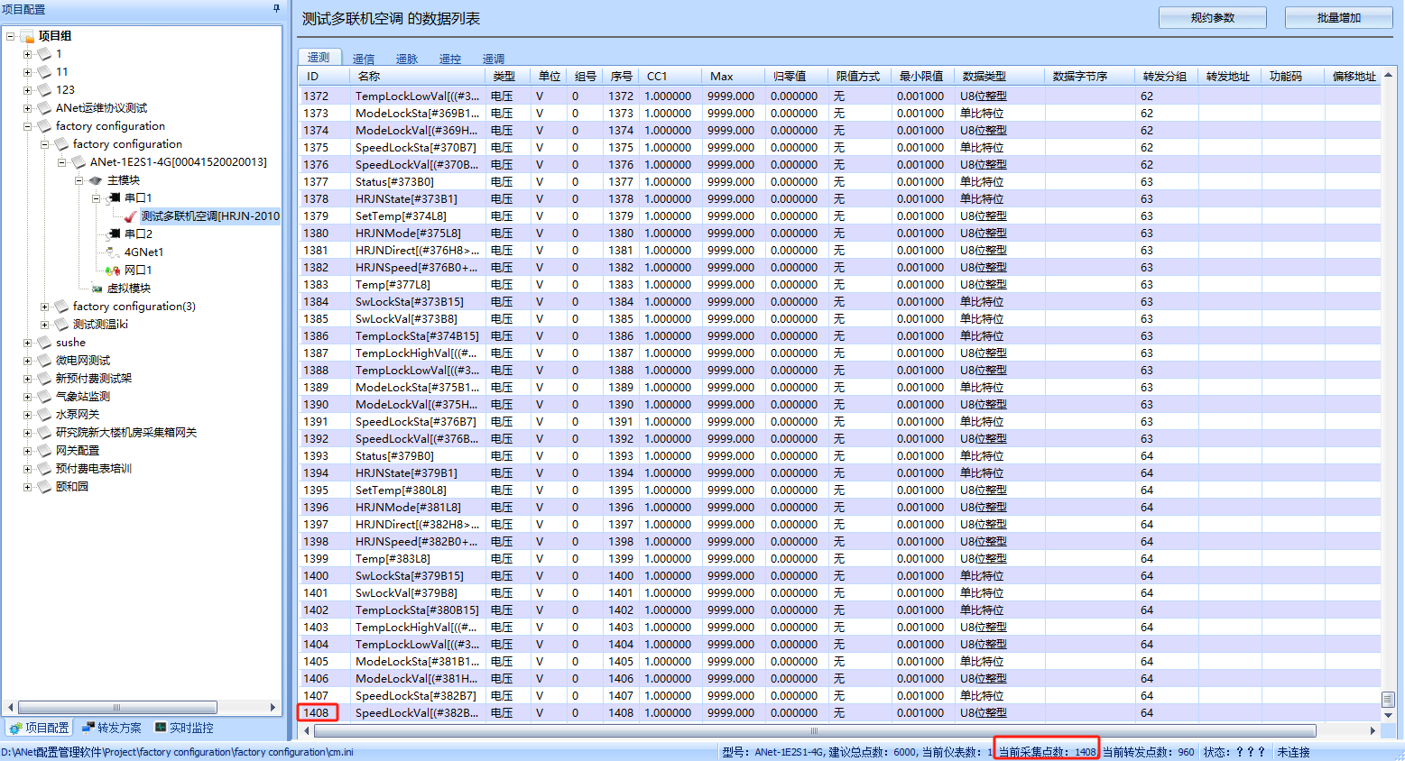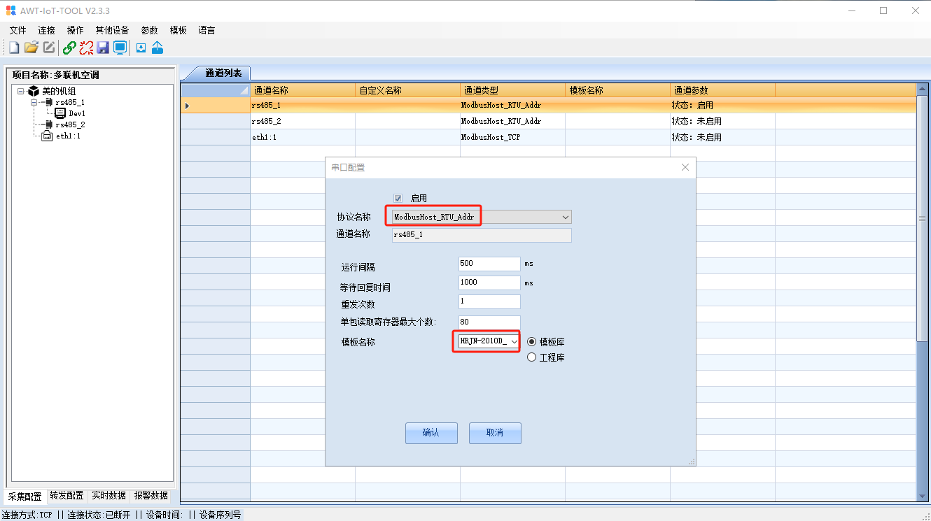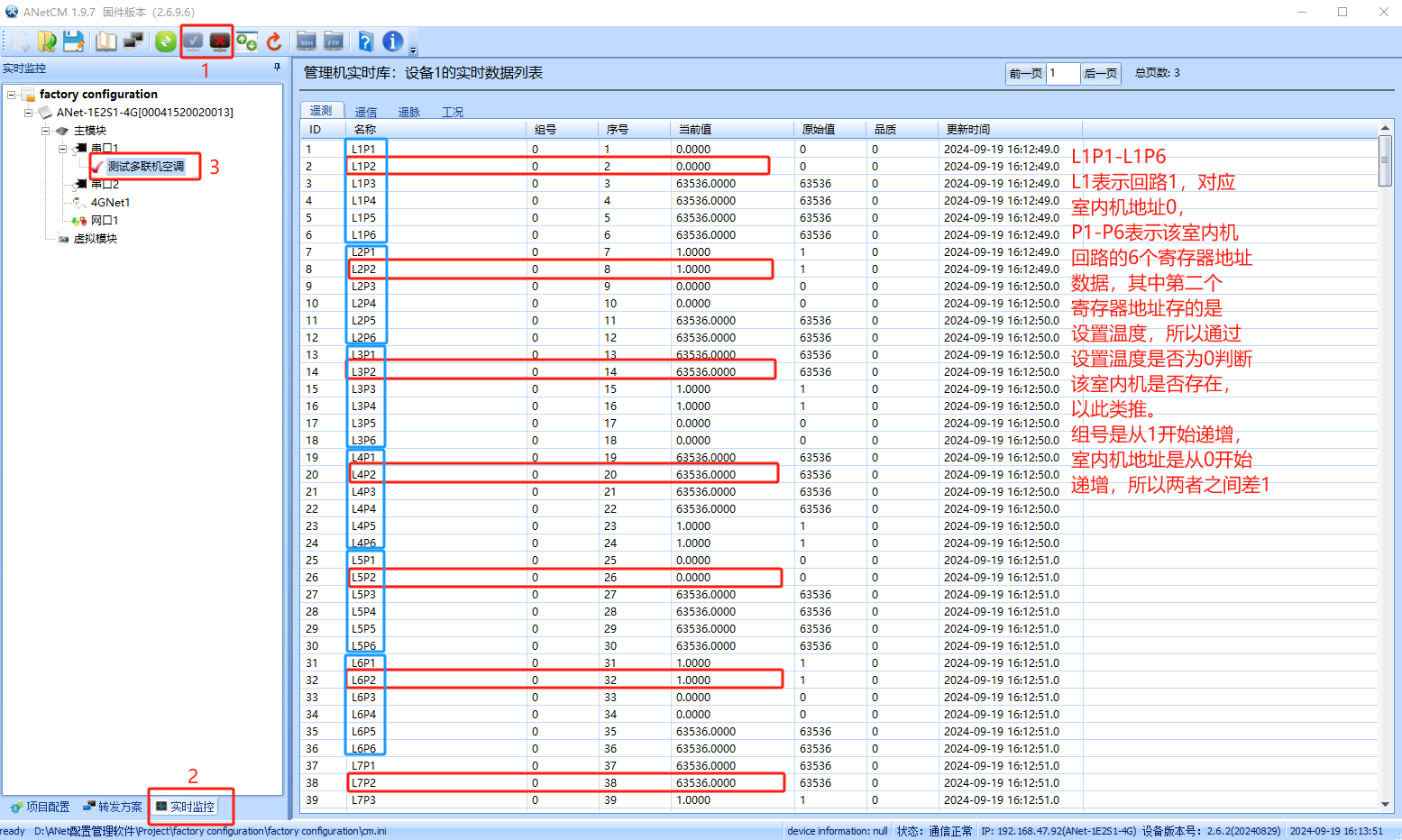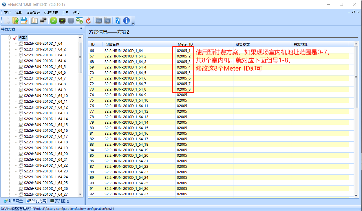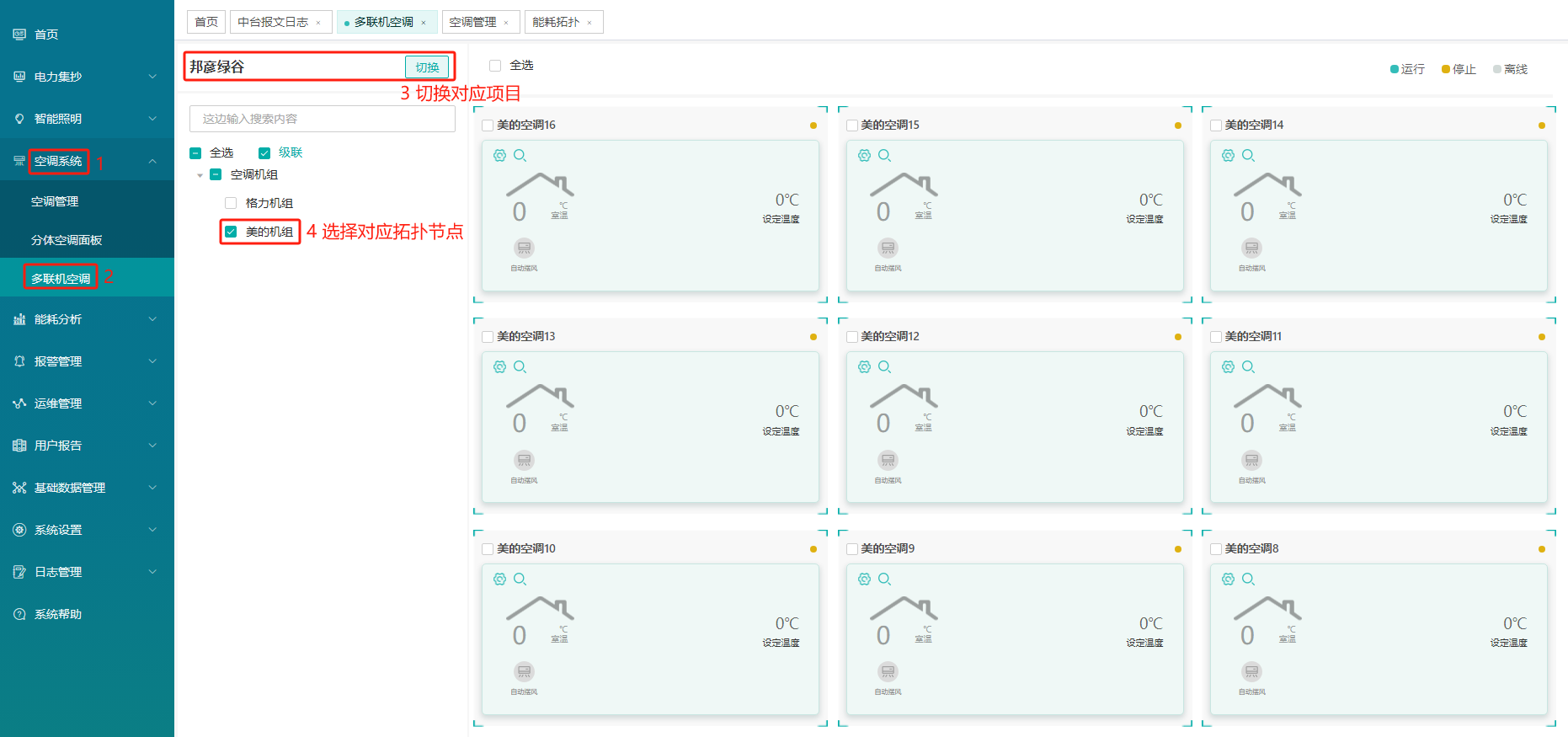### 1.方案介绍   海镕多联机空调控制器目前使用AWT200网关中台协议或ANet网关运维协议接入EIOT平台,一个海镕空调控制器只接一个室外机制冷系统,网关可以接多个海镕空调控制器。由海镕多联机空调控制器采集现场空调系统的数据,安科瑞网关根据抄表模板去采集并拆分各室内机回路的数据,每台室内机回路作为一个单独的空调子设备。   平台型号名称的**前缀**暂定为`HRJN-2020D`,与海镕分体空调面板`HRJN-2020C`作区分,根据现场室外机地址是1还是0确定型号名称**后缀**。 - `HRJN-2010D_0_64`对应室外机地址0,下面内机地址0~63,共64个,应该不常见 - `HRJN-2010D_1_64`对应室外机地址1(常用),下面内机地址0~63,共64个    海镕多联机空调控制器能够搜索到下面接的空调室内机 如空调控制器上`18-1-11`前面的`18`表示整个空调系统共有18台室内机,后面`1-11`表示室外机地址1下的地址11的室内机,虽然能够搜索到室内机地址,但是不能根据室内机地址确定到底是哪个房间的空调,需要现场通过开关机、设置参数对照平台上的数据变化,确认室内机地址和室内机的对应关系(操作示例见下文3.3)。 - 需要注意:多联机空调属于一个制冷系统,制冷模式和制热模式不能共存,已经有室内机开启制冷模式的情况下,其他的室内机开启制热模式是不生效的,其余的模式没有这种冲突,唯有制冷和制热不能共存。 平台下发开关设置、运行设置指令中台这边是通过透传方式下发到空调控制器。 #### 1.1 格力机组和美的机组调试过程(仅供参考可略过不看)   某项目现场有格力和美的两套机组,空调控制器最初使用的是海镕提供的V1.20(2022年)协议,协议规定一个室外机下最多有32个室内机,室内机地址范围是0 ~ 31。根据此协议为室外机地址1的场景编写了`HRJN-2010D`型号模板,下面带内机地址0 ~ 31共32回路。   格力机组顺利调通后接下来调试美的机组时出现问题,现场美的机组各室内机的地址不在0 ~ 31范围内,导致现有的协议用不了,并且无法通过美的的空调面板去改写室内机地址。   后来和海镕技术沟通,对方提供了一版新的V2.1协议,单个室外机地址下支持64台室内机,室内机地址范围:0 ~ 63,现场空调控制器需要升级固件。   现场美的机组控制器如下图所示,室外机地址是1,下面共16台室内机,其中这一个室内机地址是58,这种情况须使用新的型号模板`HRJN-2010D_1_64`   如果室外机地址是0的话,须使用`HRJN-2010D_0_64`模板(这种情况应该很少,海镕技术说过一般室外机地址默认是1),所以常用的应该只有`HRJN-2010D_1_64`这个型号模板。   调试前先确认海镕发的货用的是什么程序版本,如果是老版32路协议的版本,需要升级最新的64路协议的程序,升级步骤见下文2.1。   从空调控制器界面上看就可以很清楚的区分新版程序还是老版程序,如下图所示。 老版,界面颜色略显单调。  新版,内机地址和状态用绿色显示。  ### 2.海镕空调控制器使用说明 一个空调控制器下面只接一个制冷系统(室外机),室外机地址从0开始,空调控制器能够查看到制冷系统(室外机)下的空调室内机地址,但是不能和现场每一台室内机一一对应,调试完网关并在平台添加绑定各台室内机后需要现场的人配合,通过开关机、设置参数等操作去看平台上的数据变化,确定室内机回路地址和所在房间位置的对应关系 以旧版32回路程序为例,空调控制器上内机`18-1-11`前面的18表示共有18台室内机,后面1-11表示室内机地址,对应室外机地址1下的地址11的室内机,如下如所示  新版本界面有所变化,如下图所示,图中搜索到的内机地址是1-44,共16台室内机  #### 2.1 海镕空调控制器联网升级固件版本 海镕空调控制器联网后可以在线升级到最新程序版本  第一步,手机开热点,热点名称设为A,热点密码改为12345678  第二步,先拿掉A1B1线,设备重新断电上电,若设备未连上热点,重复断电上电操作,直到出现下图状态  第三步,在网络OK的情况下,按上下翻页,找到检查更新页面,长按SET确认更新下  第四步,下图V31版本正在下载中,这时候不要动设备也不要断电,等待设备更新直到版本显示V31即可,若升级失败,重复下第三步的操作  第五步,升级成功后界面如下图所示,搜索空调完成后可以按上下键统计内机地址  ### 3.调试说明 #### 3.1 AWT200网关方案调试说明(此方案没有锁定功能) ##### 3.1.1 注意事项 (1)由于AWT200目前的模板点位数上限是600个,多联机空调控制器的锁定功能(开关锁定、模式锁定、温度上下限锁定、风速锁定)此方案暂不支持,因为点位不够用,项目上若需要锁定功能,须使用ANet网关。 (2)使用AWT200网关接入,一个室内机在EIOT平台的仪表地址addr是由`串口号_空调控制器Modbus地址_回路号`组成,如: `0_5_1`,表示空调控制器接在AWT200网关第一个串口下,空调控制器的modbus地址是5,这台室内机的回路号(对应型号模板里的组号)是1。由于室内机地址从0开始递增,而AWT200网关模板里的组号是从1开始,所以平台上看到的室内机的回路号需要减去1才对应室内机实际地址,`0_5_1`这台室内机实际地址是0。 (3)由于新版的HRJN-2010D_1_64型号模板采集点位数达到了512个,而AWT200网关旧版本模板点位数上限达不到这个数量,需要升级网关固件版本从而支持模板上限达到600个点位数,目前项目现场测通的固件版本是`2579_1016_AWT200_V1.8.23.C_20240329_090939.bin` 后续使用的AWT200网关固件版本不能低于